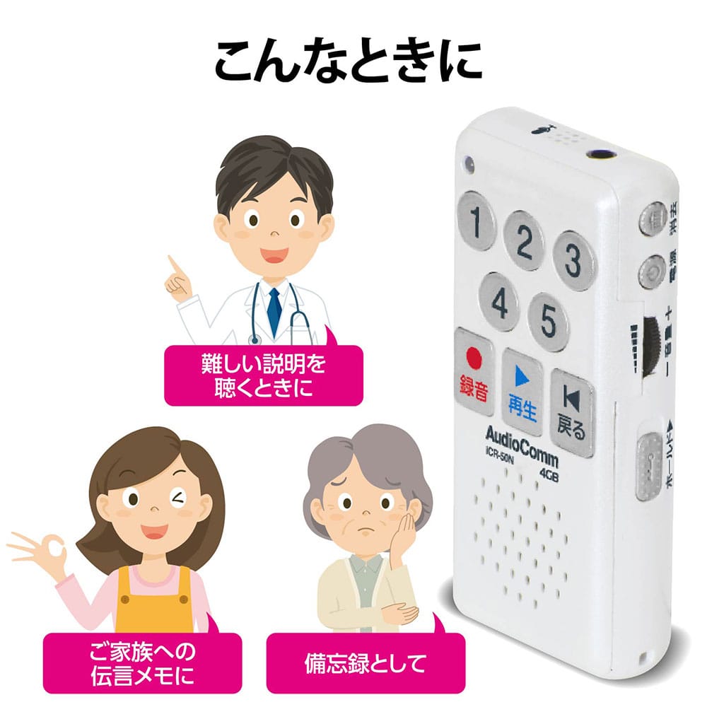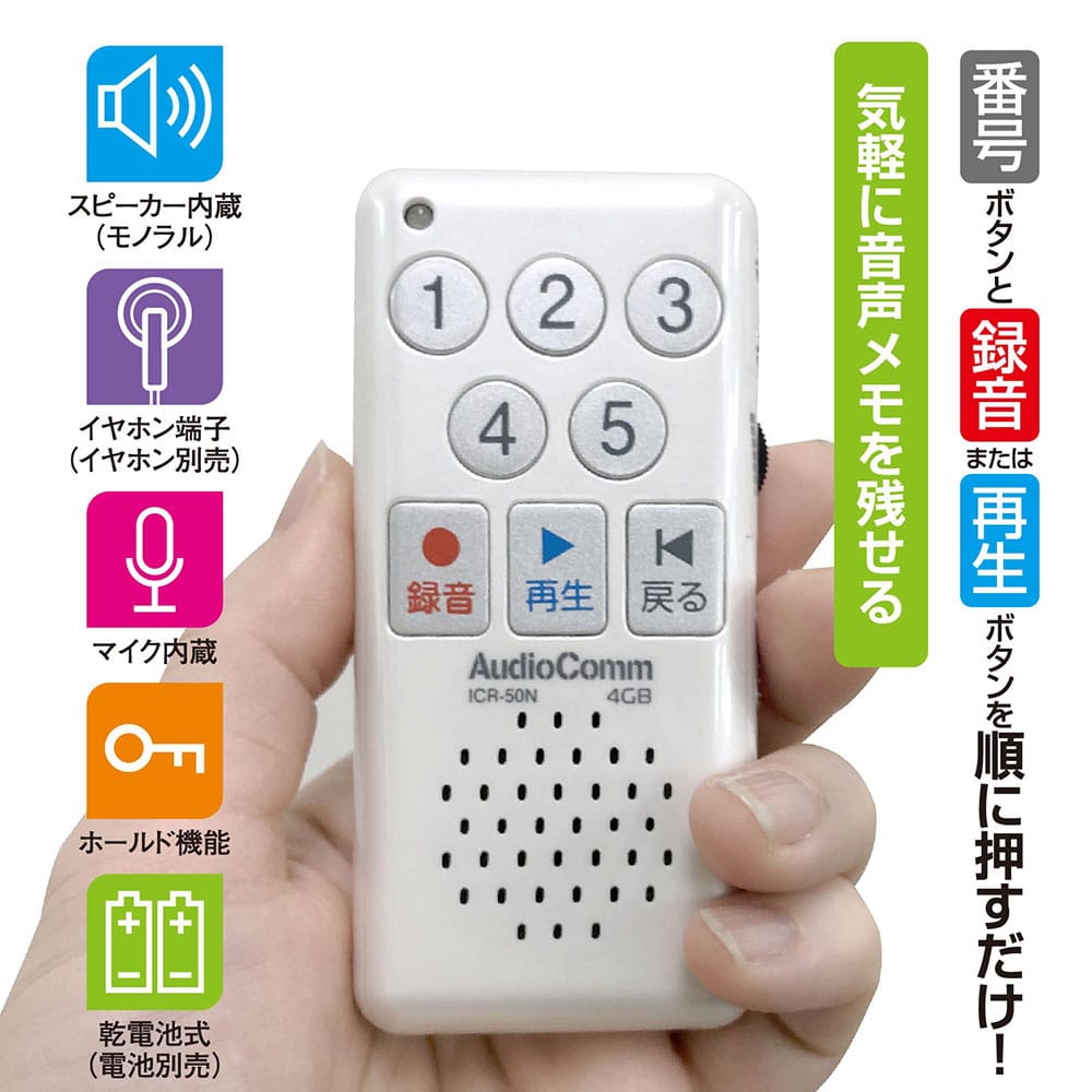 ● 録音件数最大5件 ● 内蔵メモリー4GB ● 乾電池式(単4形乾電池×2本) ● モノラルスピーカー内蔵 ● イヤホン端子付き ● マイク内蔵 ● 誤作動防止のホールド機能付き