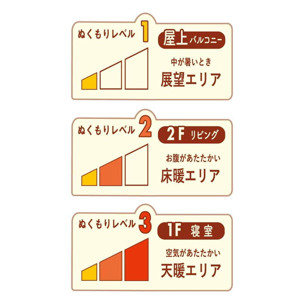●フロアごとのぬくもりレベル(レベル1 屋上バルコニー:中が暑いとき展望エリア、レベル2 2Fリビング:お腹があたたかい床暖エリア、レベル3 1F寝室:空気があたたかい天暖エリア)