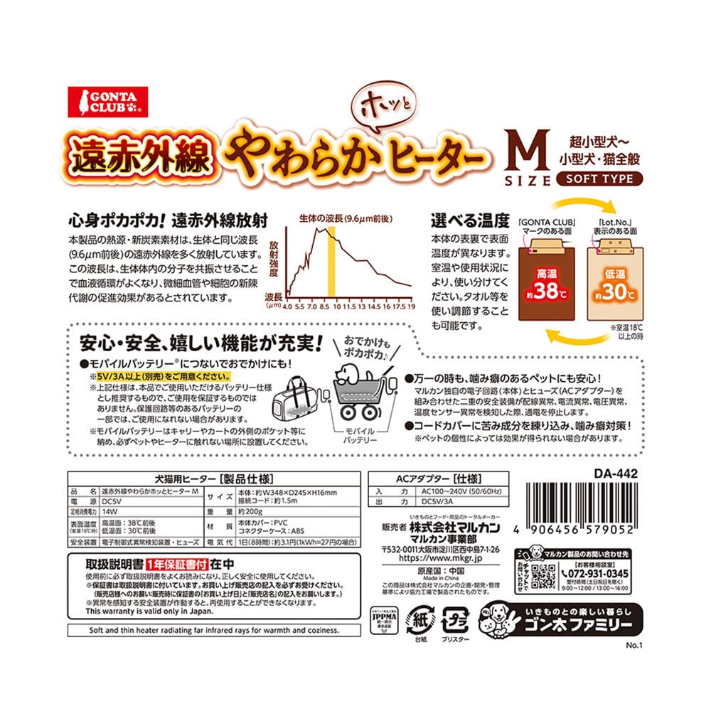 お取り扱い上の注意:本品は、ペット飼育専用ヒーターです。それ以外の目的では使用しないでください。水中や浴室等の湿気の多い場所、水のかかる場所で使用しないでください。本品は、アダプターの定格以外で使用しないでください。分解、修理、改造は絶対にしないでください。ACアダプターや接続コード、コネクターケースは濡らさないでください。濡れた手で扱わないでください。電気カーペット、電気こたつ、電気毛布などの他の暖房器具と併用しないでください。火気や暖房器具のそばに置かないでください。火災やペットの火傷、商品が変形する原因になります。本体や接続コードは、釘やピン等で固定しないでください。接続コードは束ねたまま使用しないでください。本品に穴やヒビ等の破損が生じた場合は使用しないでください。スプレー缶や発火物を、本品の上に載せたり近づけたりしないでください。ペットに噛ませる、人が飛び乗る、衝撃を与える、落とす、突起物で傷つける等はしないでください。電源を入れたまま、使用しないで放置する、外出する、お手入れする等はしないでください。