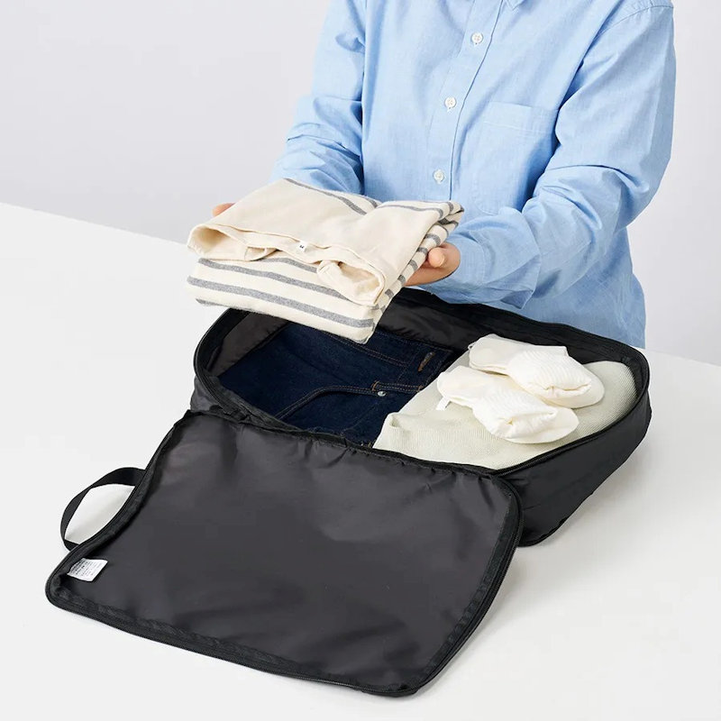2カ所にファスナーがついており本体の空気を抜きながらファスナーを締めることによってポーチを圧縮しコンパクトにすることができます。
