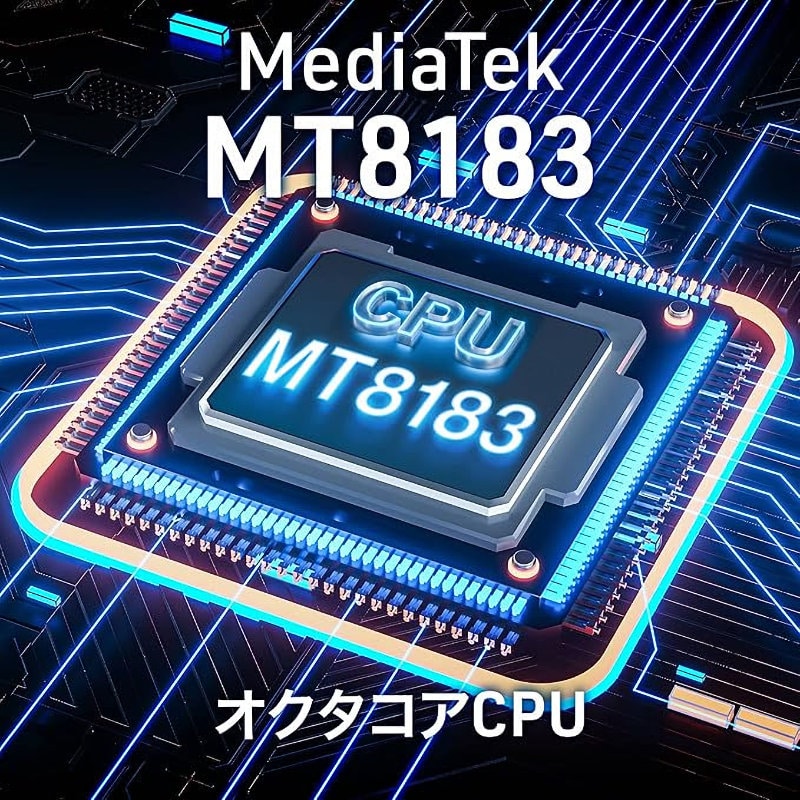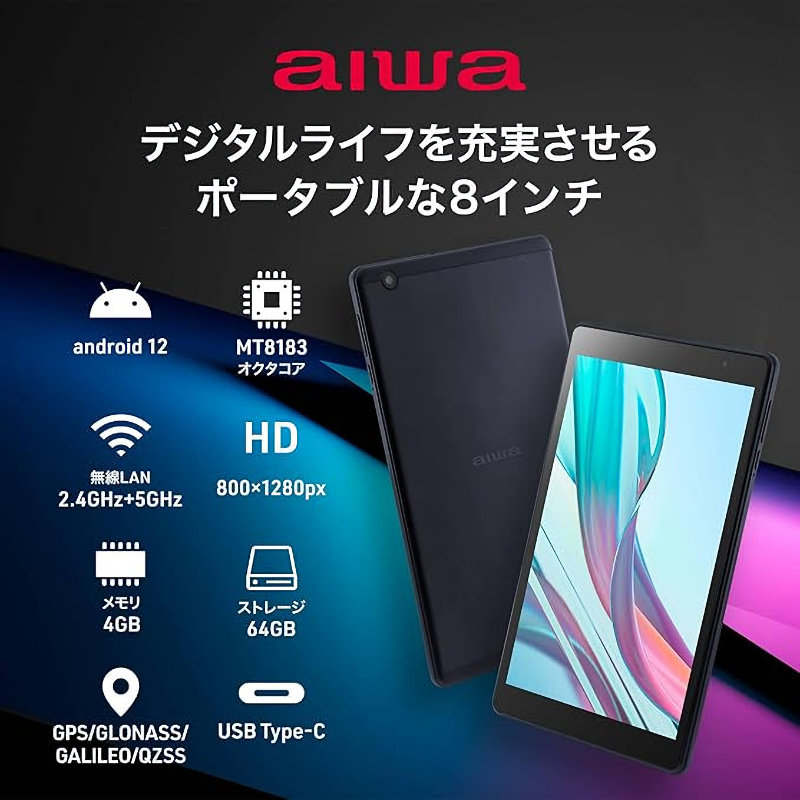 ・CPU:Mediatek MT8183 Octa core(Cortex-A73 Quad core 2GHz + Cortex-A53 Quad core 2GHz) ・GPU:ARM Mali-G72 MP3 ・メモリ:4GB ・ストレージ:64GB ・OS:android 12 ・無線LAN:IEEE 802.11 ac/a/b/g/n ・Bluetooth®:Bluetooth® 5.0 ・ディスプレイ:8インチIPS液晶モニター ・画面解像度:800×1,280px ・カメラ:フロント : 500万画素 リア : 800万画素(AF) ・衛星測位システム:GPS/GLONASS/Galileo/QZSS(みちびき) ・センサー:加速度センサー ・スピーカー:内蔵 1W 8Ω ×2 ・マイク:内蔵 ×1 ・対応メディア:microSDカード(SDHC、SDXC含む) ・インターフェイス:USB Type-Cポート ・ 3.5mmイヤフォンジャック ・ microSDカードスロット ・電源:AC電源アダプター AC100V~ 50/60Hz 5V/2A ・バッテリー:内蔵型リチウムポリマー充電池(4,400mAh/3.8V) 充電時間 : 約3時間(電源オフ/AC電源アダプター充電) ・連続使用可能時間 : 最大約6時間 ※使用状況や環境により変化する場合があります。 ・使用環境 温度 : -10~45℃ ・ 湿度 : 最大95% (結露なきこと)