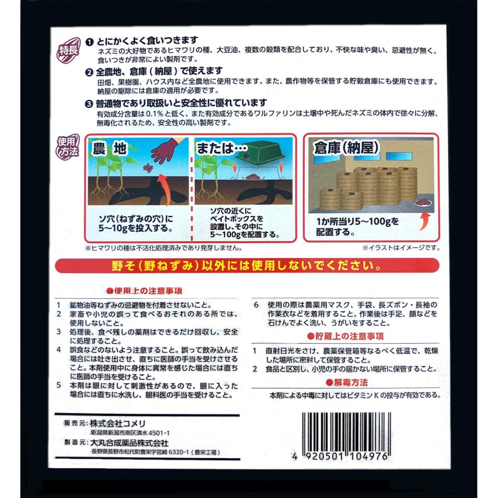 ネズミの大好物であるヒマワリの種、大豆油、複数の穀類を配合しており、不快な味や臭い、忌避性が無く、食いつきが非常によい製剤です。