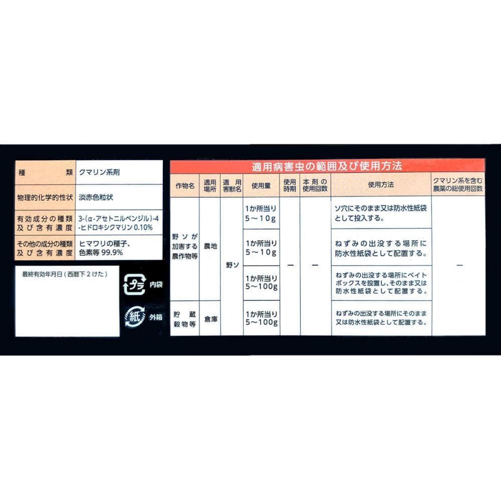 有効成分含量は0.1%と低く、また有効成分であるワルファリンは土壌中や死んだネズミの体内で徐々に分解、無毒化されるため、安全性の高い製剤です。