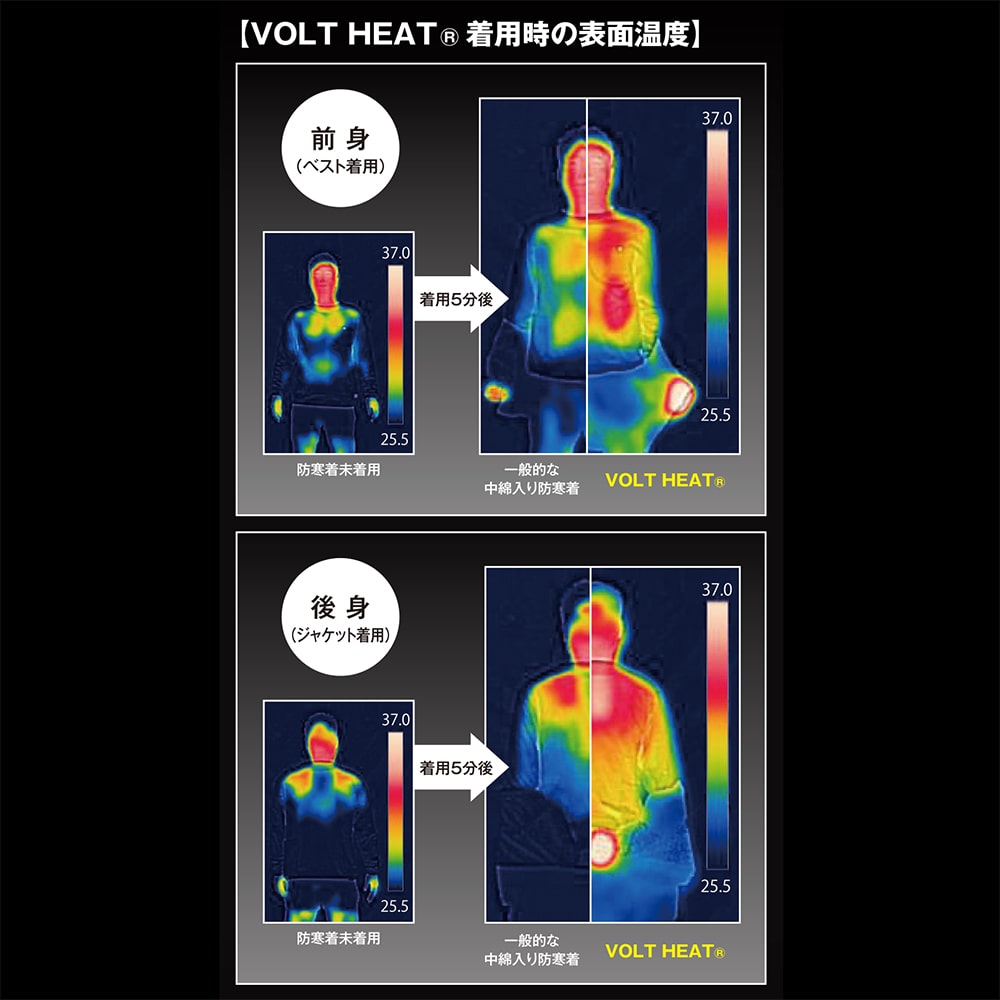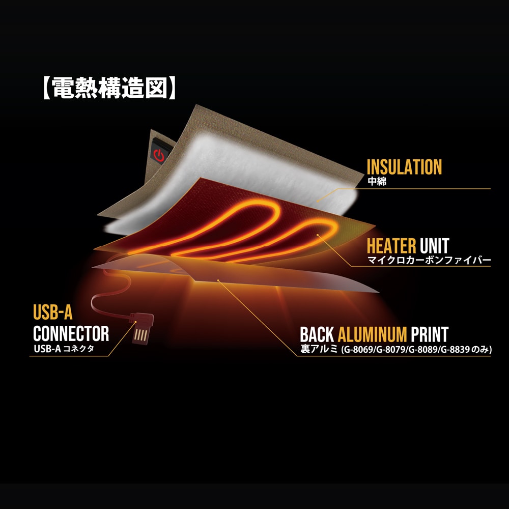 ●背中上部と脇ポケットの計3か所にある電熱シートが背中やお腹、ポケットの中で手も温めることができます。