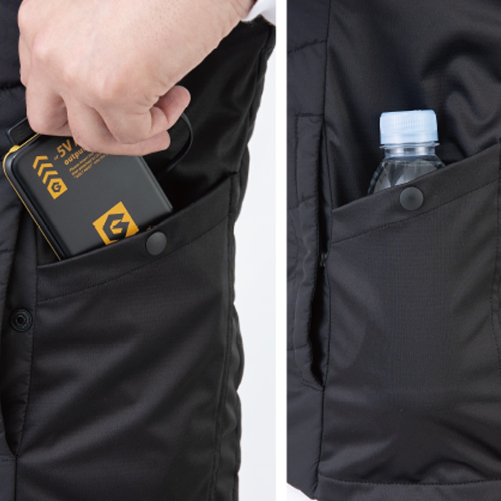●背中上部と脇ポケットの計3か所にある電熱シートが背中やお腹、ポケットの中で手も温めることができます。