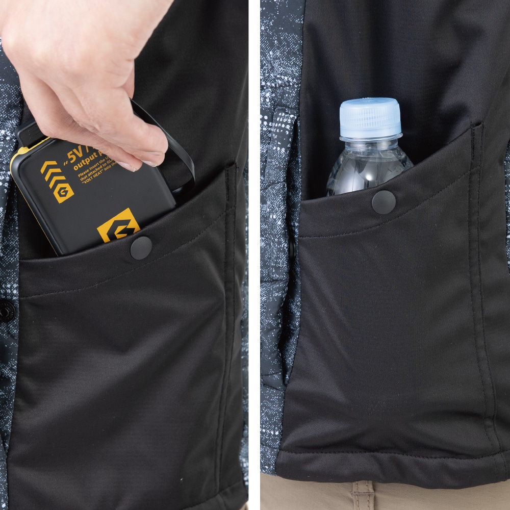 ●背中上部と脇ポケットの計3か所にある電熱シートが背中やお腹、ポケットの中で手も温めることができます。