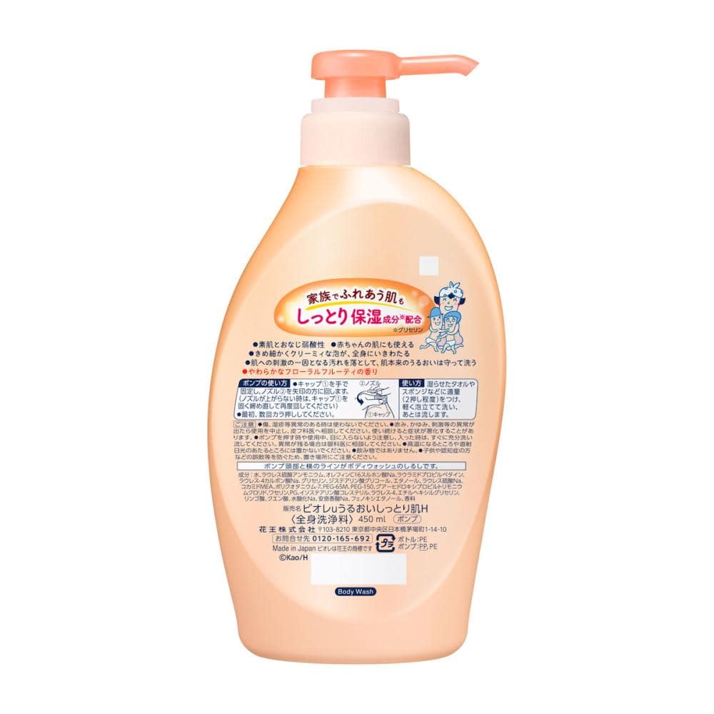 きめ細かくクリーミィな泡が、全身にいきわたる。 ※グリセリン ●素肌とおなじ弱酸性 ●赤ちゃんの肌にも使える ●肌への刺激の一員となる汚れを落として、肌本来のうるおいは守って洗い、家族みんな、すべすべ健康素肌に ●やわらかなフローラルフルーティの香り