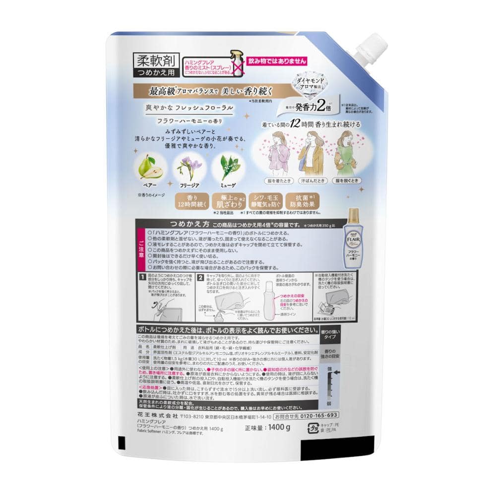使用上の注意:つめかえ方 ご注意 ○「ハミングフレア(フラワーハーモニーの香り)」のボトルにつめかえる。 ○他の柔軟剤と混ぜない。液が濁ったり、固まって使えなくなることがある。 ○液モレすることがあるので、つめかえ後は必ずキャップを閉めて立てて保管する。 ○この商品をつめかえずにそのまま使用しない。 ○開封後はできるだけ早く使い切る。 ○パックを強く持つと、液が飛び出ることがあるので注意する。 ○お問い合わせの際に必要な場合があるため、このパックを保管する。 <使用上の注意> ●用途外に使わない。 ●子供の手の届く所に置かない。 ●認知症の方などの誤飲を防ぐため、置き場所に注意する。 ●原液が直接衣料にかからないようにする。 ●使用の時は、液が目に入らないように注意する。 ●柔軟仕上げ剤の投入口や、自動投入機能付き洗たく機のタンクを使う場合は、洗たく機の取扱説明書に従う。 ●高温や低温、直射日光をさけて、保管する。
