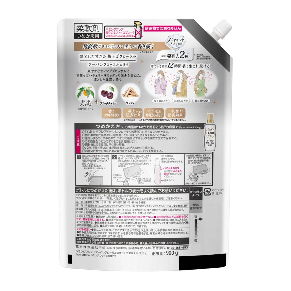 使用上の注意:つめかえ方 ご注意 ○「ハミングフレア(アーバンフローラルの香り)」のボトルにつめかえる。 ○他の柔軟剤と混ぜない。液が濁ったり、固まって使えなくなることがある。 ○液モレすることがあるので、つめかえ後は必ずキャップを閉めて立てて保管する。 ○この商品をつめかえずにそのまま使用しない。 ○開封後はできるだけ早く使い切る。 ○パックを強く持つと、液が飛び出ることがあるので注意する。 ○お問い合わせの際に必要な場合があるため、このパックを保管する。 <使用上の注意> ●用途外に使わない。 ●子供の手の届く所に置かない。 ●認知症の方などの誤飲を防ぐため、置き場所に注意する。 ●原液が直接衣料にかからないようにする。 ●使用の時は、液が目に入らないように注意する。 ●柔軟仕上げ剤の投入口や、自動投入機能付き洗たく機のタンクを使う場合は、洗たく機の取扱説明書に従う。 ●高温や低温、直射日光をさけて、保管する。