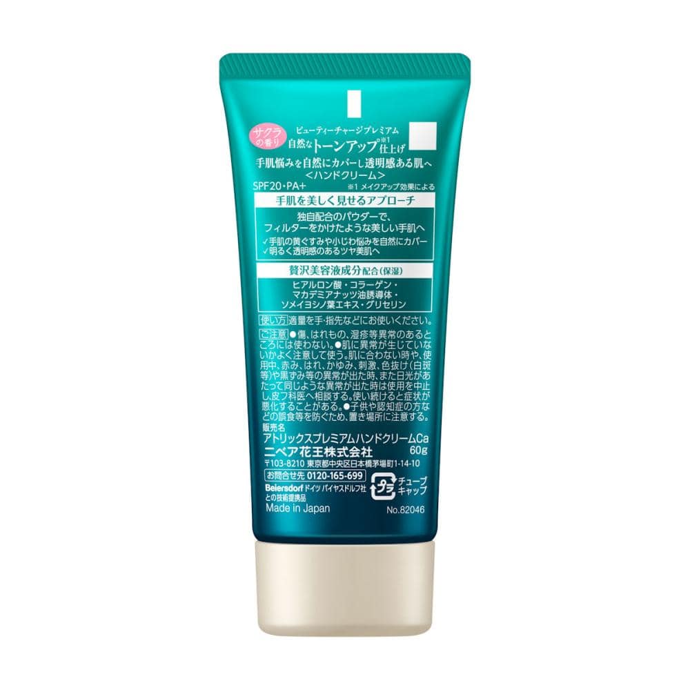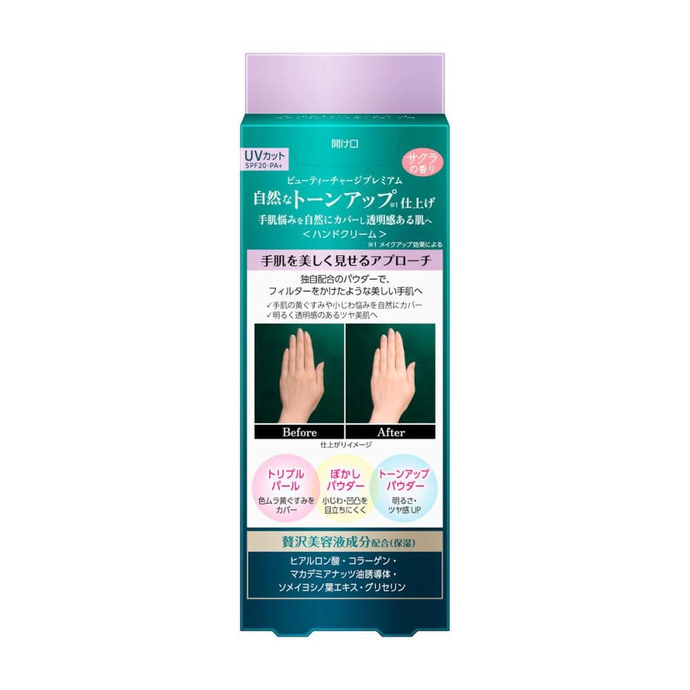 手肌悩みを自然にカバーし透明感ある肌へ。 ●手肌を美しく見せるアプローチ:独自配合のパウダーでフィルターをかけたような美しい手肌へ ●UVカット SPF20・PA+ ●贅沢美容液成分配合(保湿):ヒアルロン酸・コラーゲン・マカデミアナッツ油誘導体・ソメイヨシノ葉エキス・グリセリン ●サクラの香り ※1メイクアップ効果による