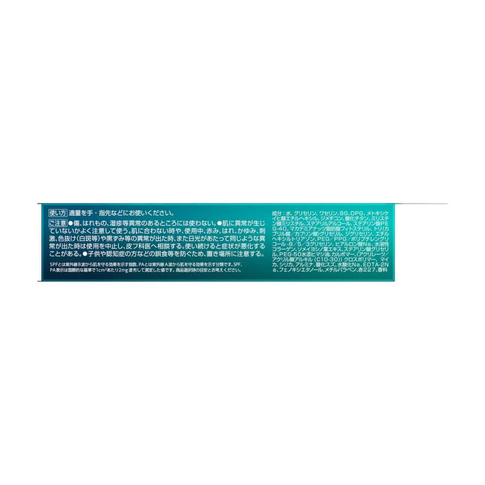 原材料・成分:水、グリセリン、ワセリン、BG、DPG、メトキシケイヒ酸エチルヘキシル、ジメチコン、酸化チタン、ミリスチン酸ミリスチル、ステアリルアルコール、ステアリン酸PE G-40、マカデミアナッツ脂肪酸フィトステリル、トリ(カプリル酸/カプリン酸)グリセリル、ジグリセリン、エチルヘキシルトリアゾン、PEG/PPG/ポリブチレングリコール-8/5/3グリセリン、ヒアルロン酸Na、水溶性コラーゲン、ソメイヨシノ葉エキス、ステアリン酸グリセリル、PEG-50水添ヒマシ油、カルボマー、(アクリレーツ/アクリル酸アルキル(C10-30))クロスポリマー、マイカ、シリカ、アルミナ、酸化スズ、水酸化Na、EDTA-2Na、フェノキシエタノール、メチルパラベン、赤227、香料