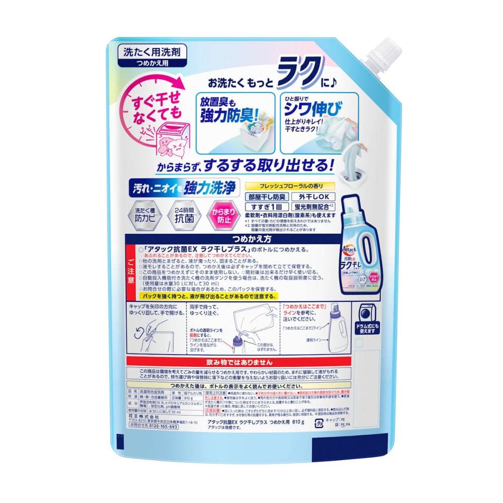 使用上の注意:つめかえ方 ご注意 ○「アタック抗菌EX ラク干しプラス」のボトルにつめかえる。あふれることがあるので、注意してつめかえてください。 ○他の洗剤とまぜると、液が濁ったり、固まることがある。 ○液モレすることがあるので、つめかえ後は必ずキャップを閉めて立てて保管する。 ○この商品をつめかえずにそのまま使用しない。○開封後は出来るだけ早く使い切る。 ○自動投入機能付き洗たく機の洗剤タンクを使う場合は、洗たく機の取扱説明書に従う。(使用量は水量30Lに対して30ml) ○お問合せの際に必要な場合があるため、このパックを保管する。 パックを強く持つと、液が飛び出ることがあるので注意する。 使用上の注意 ●用途外に使わない。 ●子供の手の届く所に置かない。 ●認知症の方等の誤飲を防ぐため、置き場所に注意する。 ●使用後は手をよく洗う。 ●荒れ性の方や長時間又は原液で使う場合は炊事用手袋を使う。 ●原液が洗たく機のフタ等についた時はすぐに水でふきとる。放置すると傷むことがある。※低温で凍った場合、常温に戻してお使いください。