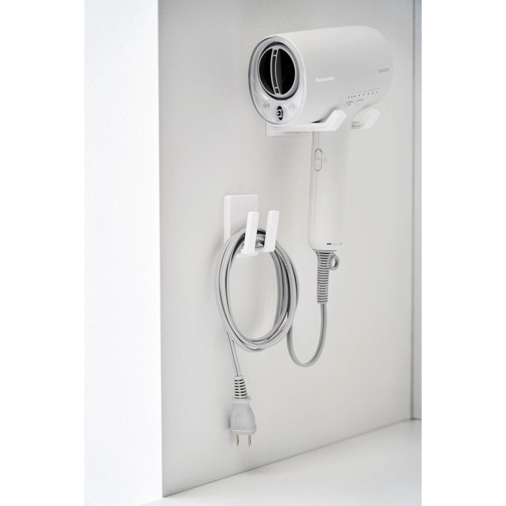 穴跡が目立たない石こうボートピンで壁に取り付けベースを設置し本体を差し込むだけ。(木ネジでも取り付け可能) ドライヤーハンガー・コードホルダー:ABS樹脂 クッション:シリコーン