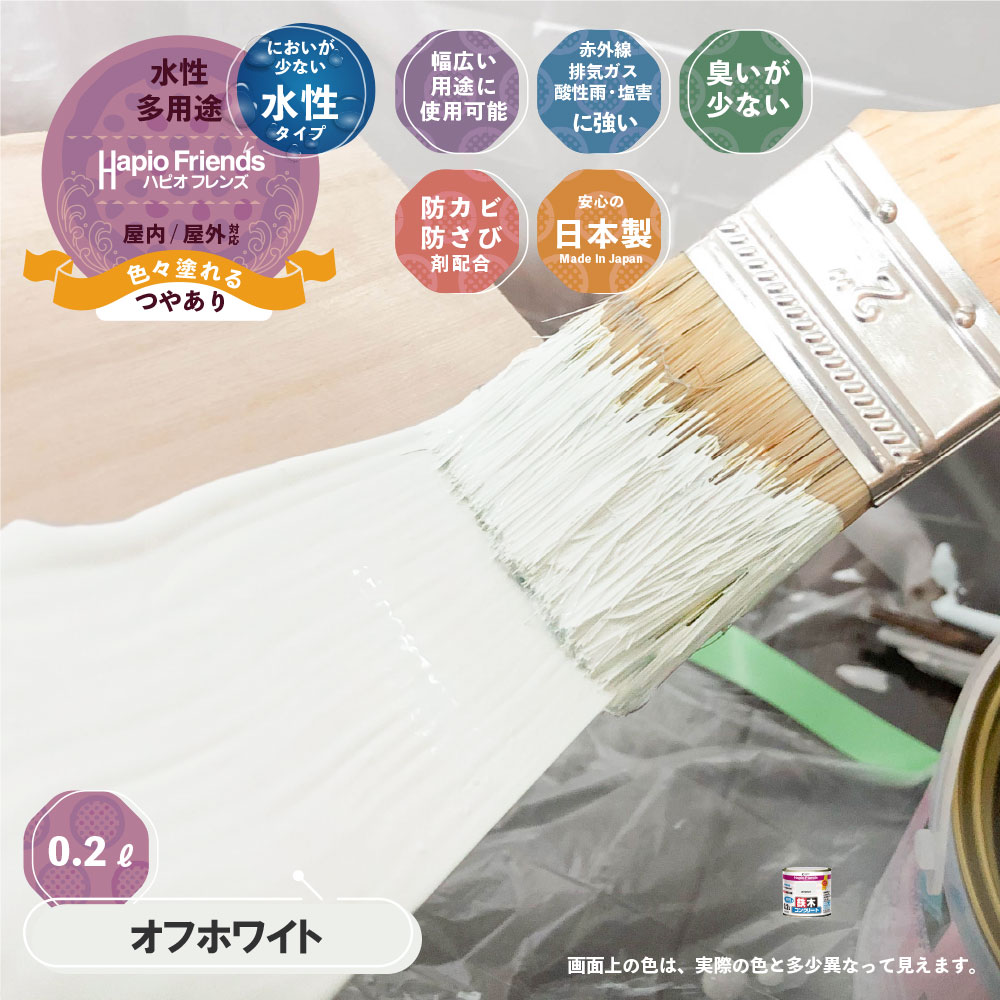 ●紫外線・排気ガス・酸性雨・塩害に強い塗膜を作り、塗装部を長期間保護します。 ●屋内外の木部・鉄部・コンクリート・プラスチックまで幅広い用途に使用できます。 ●防カビ剤配合なので長期間カビの発生を防ぎます。 ●臭いが少なく、乾燥が速く、塗りやすい水性塗料です。 ※水性でも乾燥すると水で流れ落ちることはありません。 ●塗れるもの ・窓枠、格子、羽目板、雨戸、板べい、ドア、ガーデニング用品などの屋内外の木製品 ・門扉、物置、フェンス、電気・機械器具、農機具などの屋内外の鉄製品 ・発泡スチロール、プラスチック(硬質塩ビ、アクリル、ABS)※ポリエチレン、ポリプロピレンなどは除く ・浴室、台所、洗面所、トイレなど屋内のコンクリート・モルタル壁、板壁 ・外かべ(コンクリート、モルタル、サイディング※セラミック系は除く)、ブロック塀 ●塗れないもの ・自動車、バイク、高級家具、ユニットバス、フローリング床、コンクリート床、ビニールかべ紙 ・食器・玩具など口に触れる危険性のある物 ・吸い込みのない木材(プリント合板・デコラ板など化粧板) ・鉄以外の金属(アルミ、ステンレス、メッキ、真ちゅう、銅、ホーローなど)、塩ビ鋼板 ・タイル、陶器、天然石 ・シリコン・フッ素・セラミックなど特殊加工された素材 ・ストーブなど高温部分 ・テーブル天面、荷重が掛かったり、常に衣服が接したり、高温の物を置く椅子・棚 ・釉薬瓦・無釉薬瓦(和瓦などの粘土系瓦)、施釉セメント瓦、コンクリート瓦、乾式洋瓦(モニエル瓦)、シングル系瓦、天然石瓦 ・常に水の浸かる所(プール・浴槽・浴室の床および立ちあがり・池) ●乾燥時間 20℃:約1時間(塗り重ねる時は4時間以上) 冬期:約2時間(塗り重ねる時は6時間以上) ●うすめ液・用具の手入れ ・塗料の粘度が高く、塗りにくい時に5%以内の水でうすめてください。※うすめ過ぎは塗装不良の原因となりますのでご注意ください。 ・使い終えた刷毛や用具なども水で洗ってください。