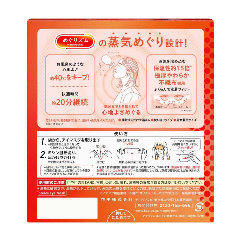 毎日のめぐり習慣に めぐりズムの『蒸気めぐり設計』!気分までときほぐれて心地よさめぐる。 アイマスク:お風呂のような心地よさ約40℃の蒸気浴 快適時間約20分。蒸気を溜め込む保温性 約1.5倍※極厚やわらか不織布採用。顔の凹凸に密着フィット。忙しい日々、働き続けた目に。