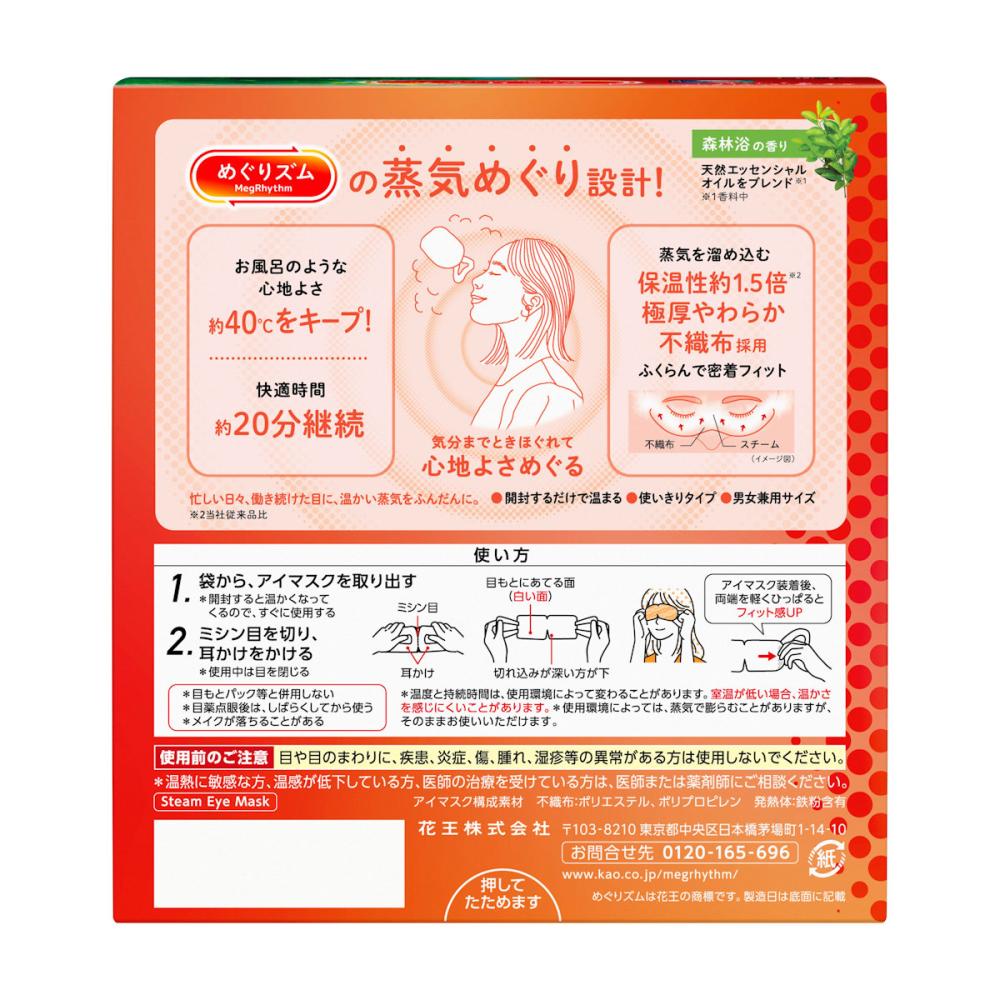 毎日のめぐり習慣に めぐりズムの『蒸気めぐり設計』!気分までときほぐれて心地よさめぐる。 アイマスク:お風呂のような心地よさ約40℃の蒸気浴 快適時間約20分。蒸気を溜め込む保温性 約1.5倍※極厚やわらか不織布採用。顔の凹凸に密着フィット。忙しい日々、働き続けた目に。