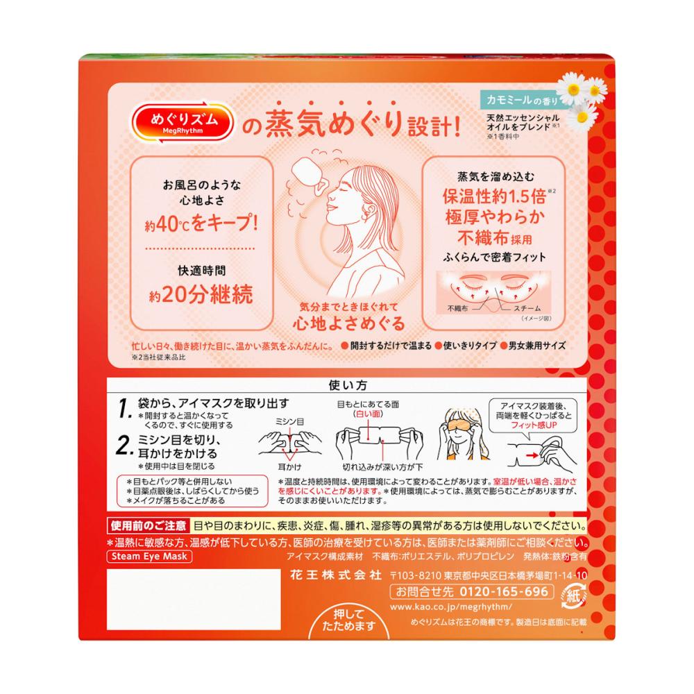 毎日のめぐり習慣に めぐりズムの『蒸気めぐり設計』!気分までときほぐれて心地よさめぐる。 アイマスク:お風呂のような心地よさ約40℃の蒸気浴 快適時間約20分。蒸気を溜め込む保温性 約1.5倍※極厚やわらか不織布採用。顔の凹凸に密着フィット。忙しい日々、働き続けた目に。