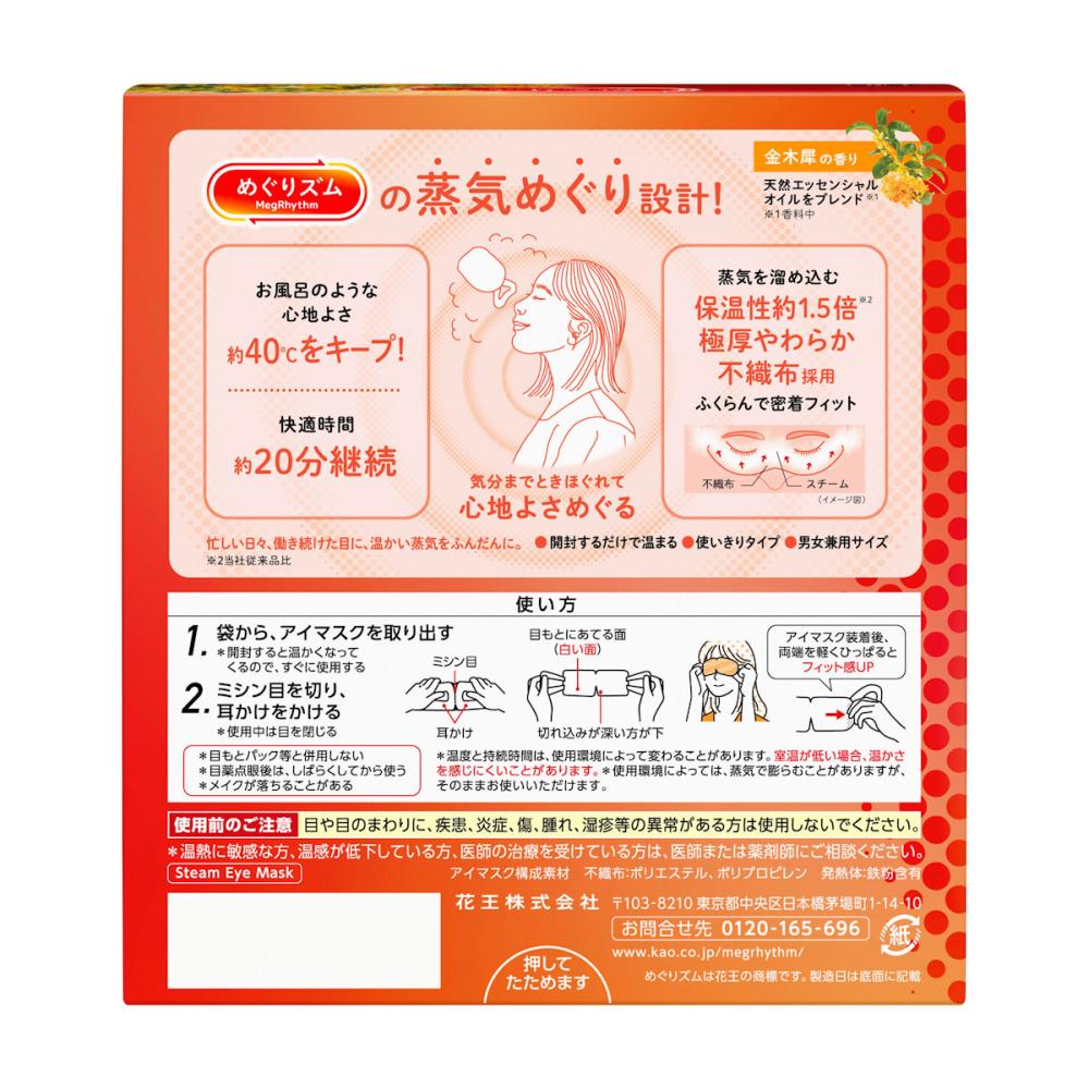 毎日のめぐり習慣に めぐりズムの『蒸気めぐり設計』!気分までときほぐれて心地よさめぐる。 アイマスク:お風呂のような心地よさ約40℃の蒸気浴 快適時間約20分。蒸気を溜め込む保温性 約1.5倍※極厚やわらか不織布採用。顔の凹凸に密着フィット。忙しい日々、働き続けた目に。