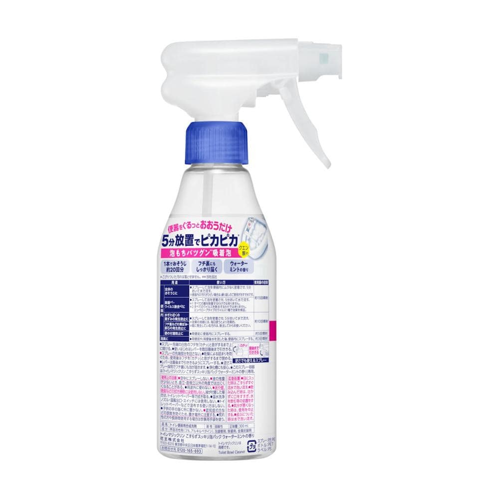 泡もちバツグン吸着泡で便器をぐるっとおおうだけ。 ほったらかして(5分以上放置)トイレピカピカ! ゴシゴシいらずでラクラクきれい! 消臭もできるクエン酸in処方のトイレ便器内専用クリーナー! 逆さスプレーできるから、フチ裏もしっかりパック。 スッキリとしたウォーターミントの香り 当社品比 便器内専用、こびりついた汚れは落とせません。