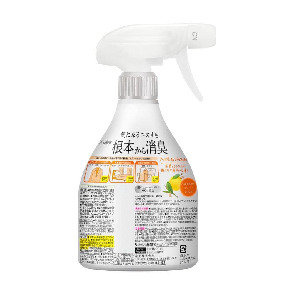 ◆布の奥まで浸透して、イヤなニオイを撃退 ◆中和消臭技術+皮脂酸化ブロック技術で、あとから衣類・布製品に付着する汗・皮脂臭の防臭まで ◆99%ウイルス除去*※ ◆アールグレイ&シトラスの香り *すべての菌・ウイルスを除去するわけではありません。布上での効果。 ※エンベロープタイプのウイルス1種で効果を検証。