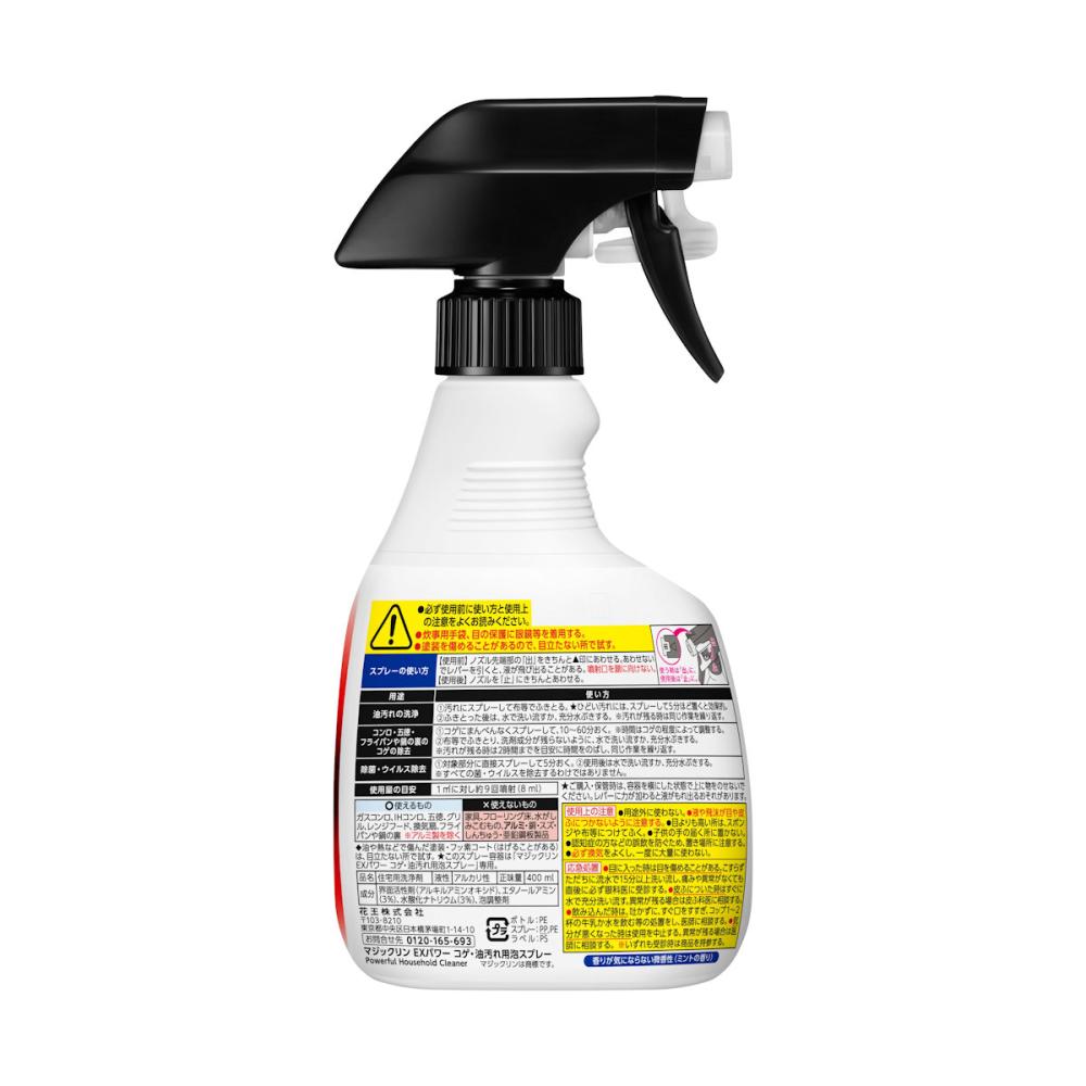 商品の利用(調理)方法:スプレーの使い方 【使用前】ノズル先端部の「出」をきちんと▲印にあわせる。あわせないでレバーを引くと、液が飛び出ることがある。噴射口を顔に向けない。 【使用後】ノズルを「止」にきちんとあわせる。 油汚れの洗浄 1.汚れにスプレーして布等でふきとる。★ひどい汚れには、スプレーして5分ほど置くと効果的。 2.ふきとった後は、水で洗い流すか、充分水ぶきする。※汚れが残る時は同じ作業を繰り返す。 コンロ・五徳・フライパンや鍋の裏のコゲの除去 1.コゲにまんべんなくスプレーして、10~60分おく。※時間はコゲの程度によって調整する。 2.布等でふきとり、洗剤成分が残らないように、水で洗い流すか、充分水ぶきする。 ※汚れが残る時は2時間までを目安に時間をのばし、同じ作業を繰り返す。 除菌・ウイルス除去 1.対象部分に直接スプレーして5分おく。 2.使用後は水で洗い流すか、充分水ぶきする。 ※すべての菌・ウイルスを除去するわけではありません。
