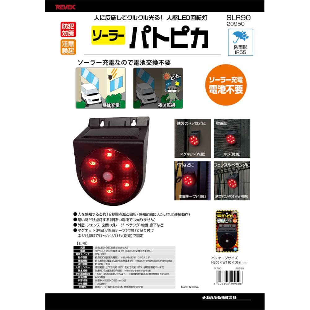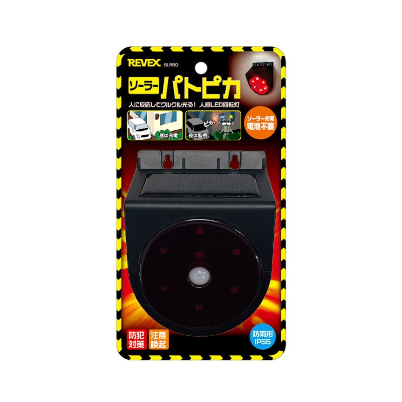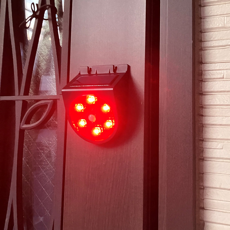 製品仕様 光源:赤色LED×6個 電源:リチウムイオン電池3.7V/800mA(交換不可) 動作回数:約2000回(満充電時) 点灯条件:10ルクス以下で点滅 点灯時間:約12秒間(固定) 人感センサー:感知範囲上下方向100°、左右方向120°、感知距離5mまで(夏場は短くなります) 設置場所:屋外の日の当たる場所 防水企画:IP55 付属品:取付プレート、取付ネジ、樹脂リブ、両面テープ 外形寸法:縦122×横85×奥行50mm(約)