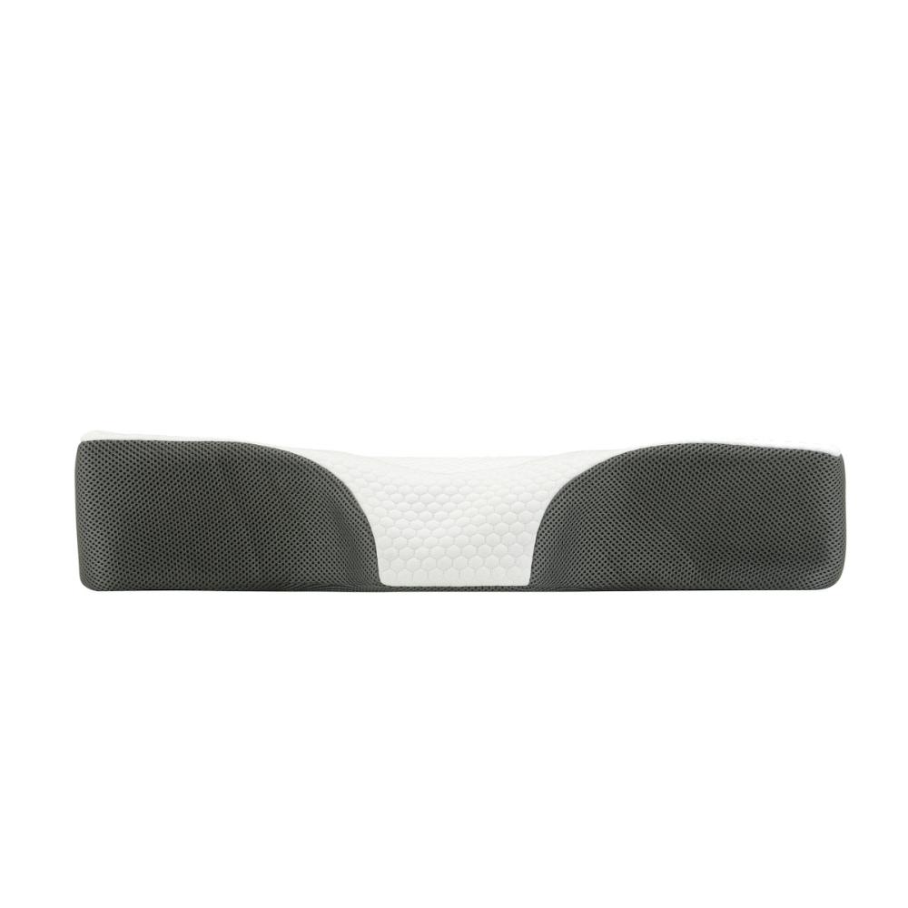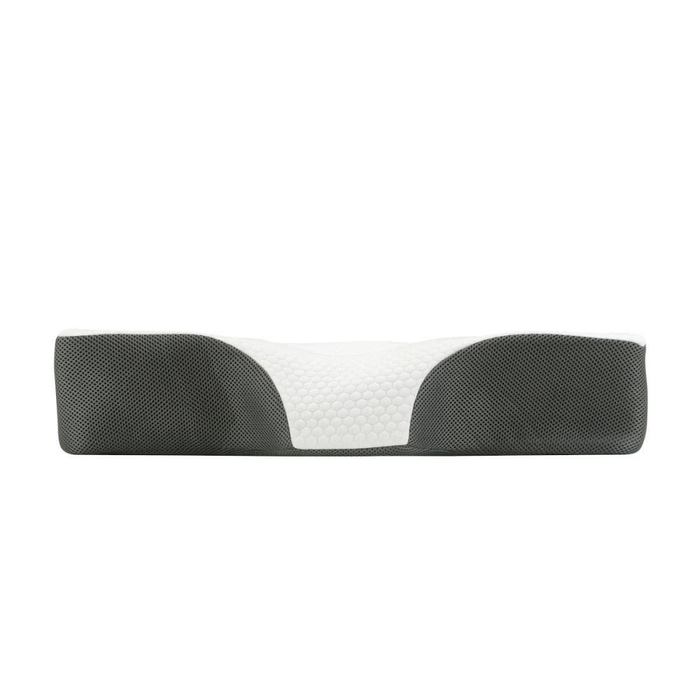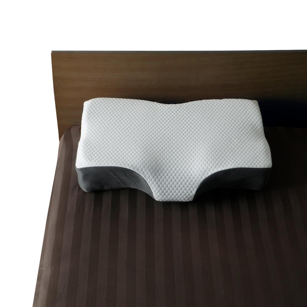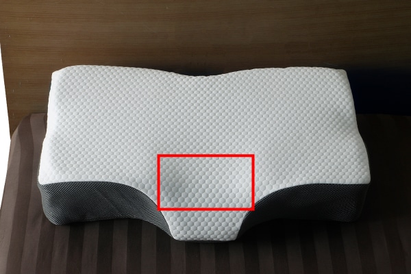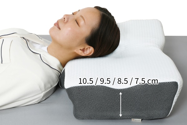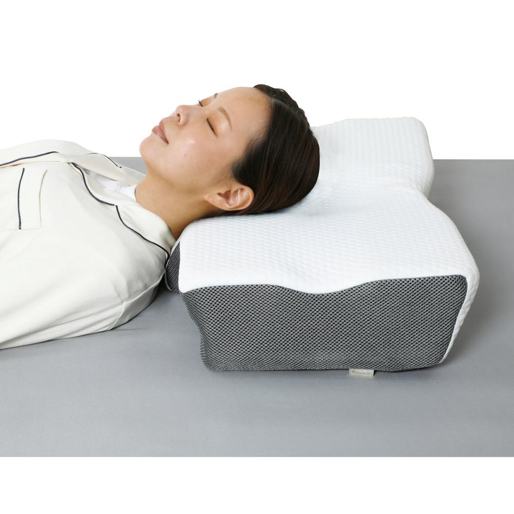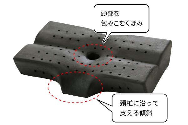 枕の中心部の丸い窪みと、頚椎を支える傾斜によって頭と首を安定して支えます。