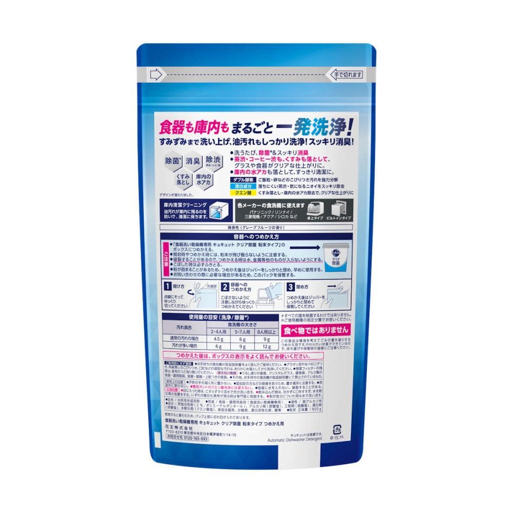 ご飯粒・卵などのこびりつき汚れも強力分解し、洗うたび除菌※・スッキリ消臭! 茶渋・コーヒー渋、くすみも落として、グラスや食器がクリアな仕上がりに。 庫内の水アカ対策もできます。 つめかえ用。 微香性(グレープフルーツの香り)。 ※すべての菌を除菌するわけではありません。