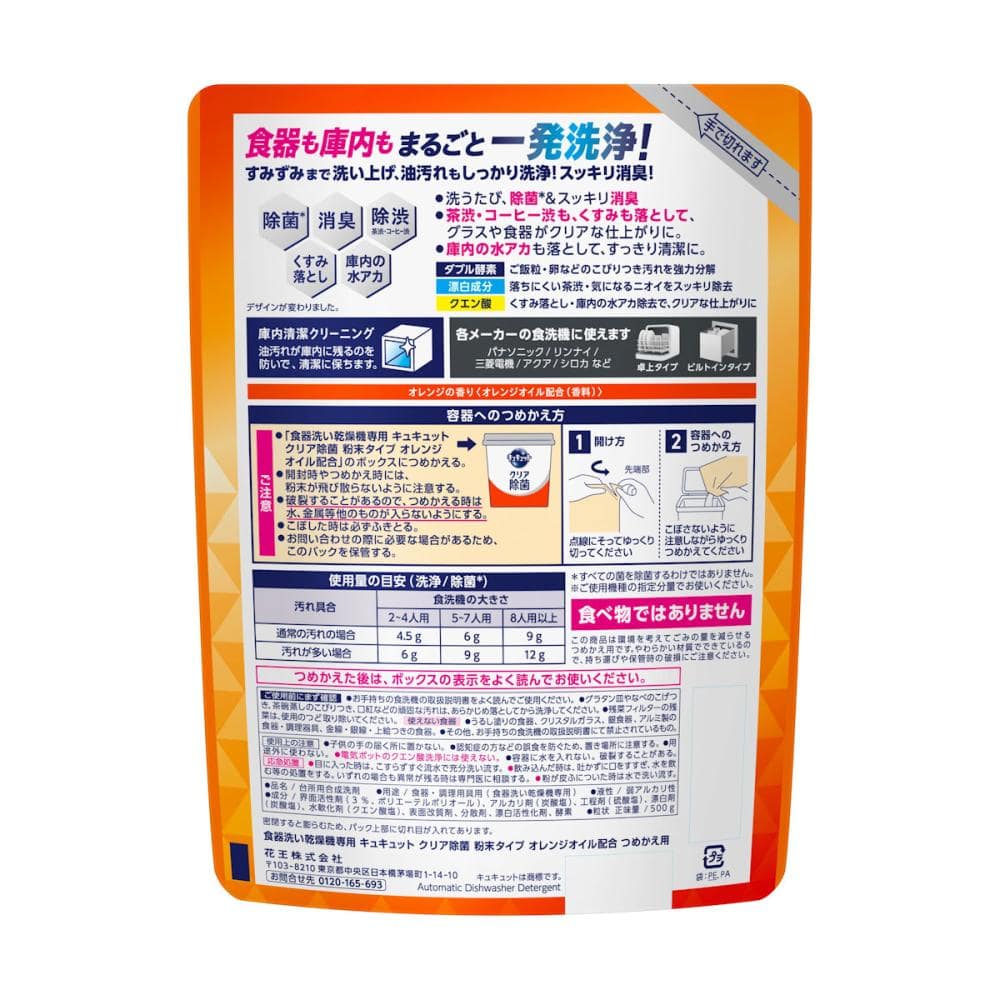 使用上の注意:容器へのつめかえ方 ご注意 ●「食器洗い乾燥機専用 キュキュット クリア除菌 粉末タイプ オレンジ オイル配合」のボックスにつめかえる。 ●開封時やつめかえ時には、粉末が飛び散らないように注意する。 ●破裂することがあるので、つめかえる時は水、金属等他のものが入らないようにする。 ●こぼした時は必ずふきとる。 ●お問い合わせの際に必要な場合があるため、このパックを保管する。 使用上の注意 ●子供の手の届く所に置かない。 ●認知症の方などの誤食を防ぐため、置き場所に注意する。 ●用途外に使わない。 ●電気ポットのクエン酸洗浄には使えない。 ●容器に水を入れない。破裂することがある。