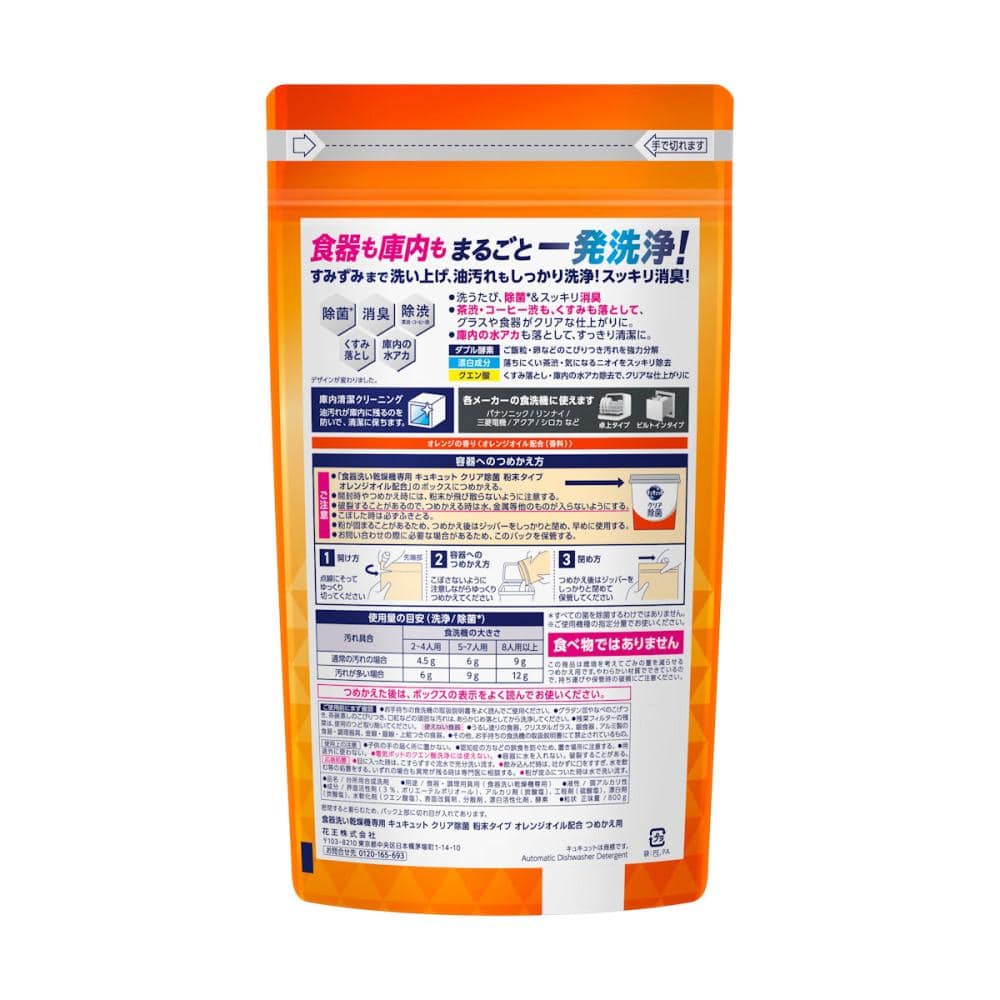使用上の注意:容器へのつめかえ方 ご注意 ●「食器洗い乾燥機専用 キュキュット クリア除菌 粉末タイプ オレンジ オイル配合」のボックスにつめかえる。 ●開封時やつめかえ時には、粉末が飛び散らないように注意する。 ●破裂することがあるので、つめかえる時は水、金属等他のものが入らないようにする。 ●こぼした時は必ずふきとる。 ●お問い合わせの際に必要な場合があるため、このパックを保管する。 使用上の注意 ●子供の手の届く所に置かない。 ●認知症の方などの誤食を防ぐため、置き場所に注意する。 ●用途外に使わない。 ●電気ポットのクエン酸洗浄には使えない。 ●容器に水を入れない。破裂することがある。