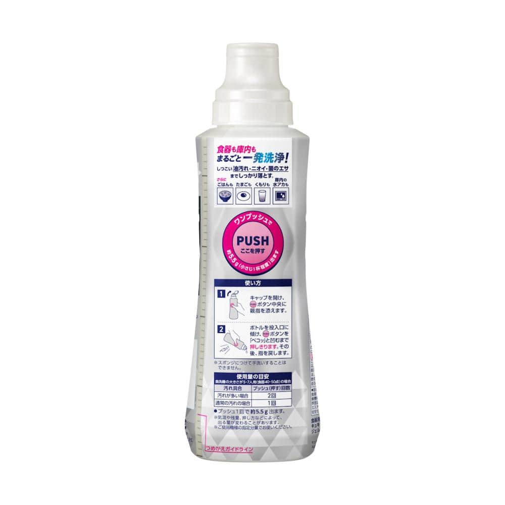 商品の利用(調理)方法:1 キャップを開け、PUSHボタン中央に親指を添えます。 2 ボトルを投入口に傾け、PUSHボタンを「ペコッ」と凹むまで押しきります。その後、指を戻します。 ※スポンジにつけて手洗いすることはできません。