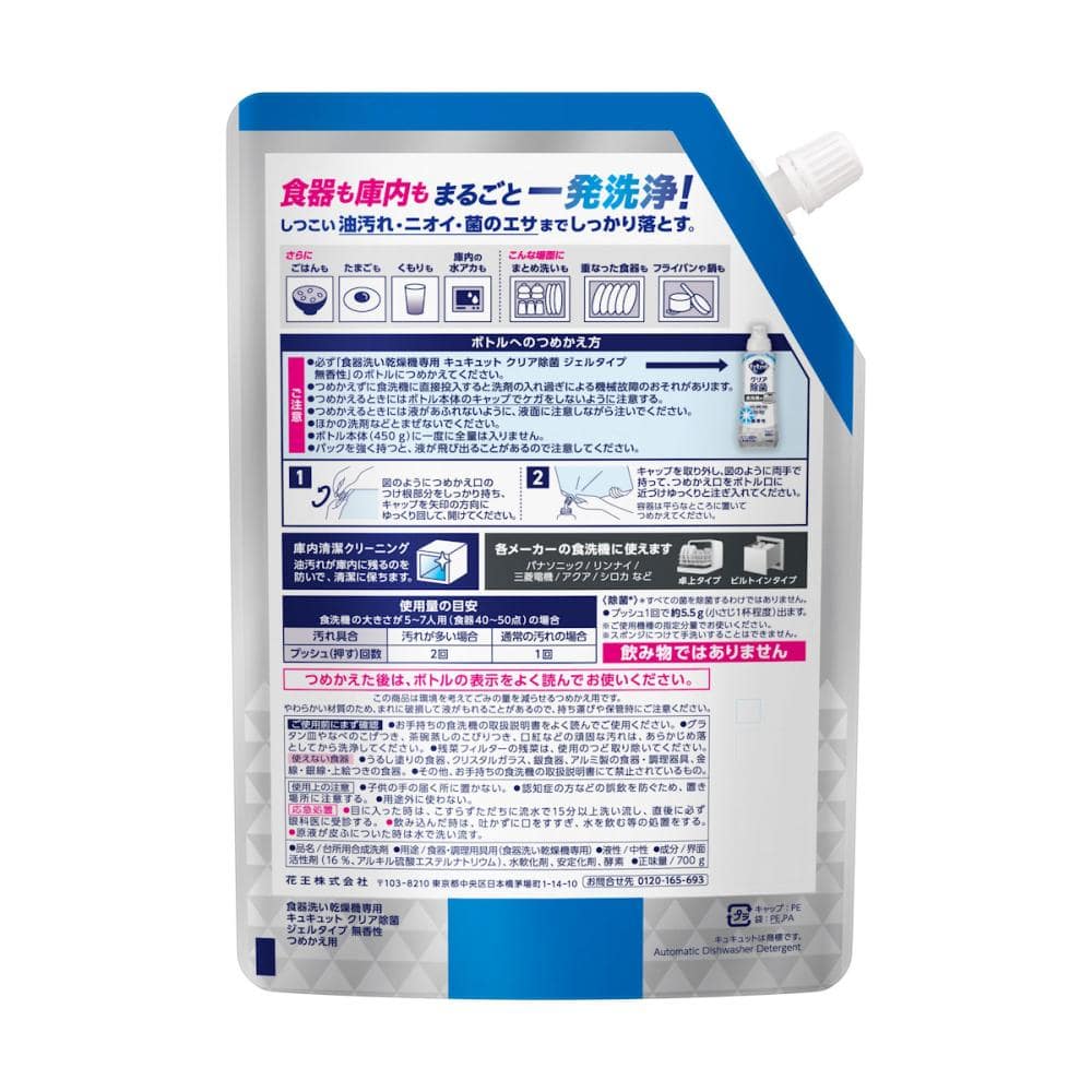使用上の注意:ボトルへのつめかえ方 ご注意 ●必ず「食器洗い乾燥機専用 キュキュット クリア除菌 ジェルタイプ無香性」のボトルにつめかえてください。 ●つめかえずに食洗機に直接投入すると洗剤の入れ過ぎによる機械故障のおそれがあります。 ●つめかえるときにはボトル本体のキャップでケガをしないように注意する。 ●つめかえるときには液があふれないように、液面に注意しながら注いでください。 ●ほかの洗剤などとまぜないでください。 ●ボトル本体(450 g)に一度に全量は入りません。 ●パックを強く持つと、液が飛び出ることがあるので注意してください。 使用上の注意 ●子供の手の届く所に置かない。 ●認知症の方などの誤飲を防ぐため、置き場所に注意する。 ●用途外に使わない。