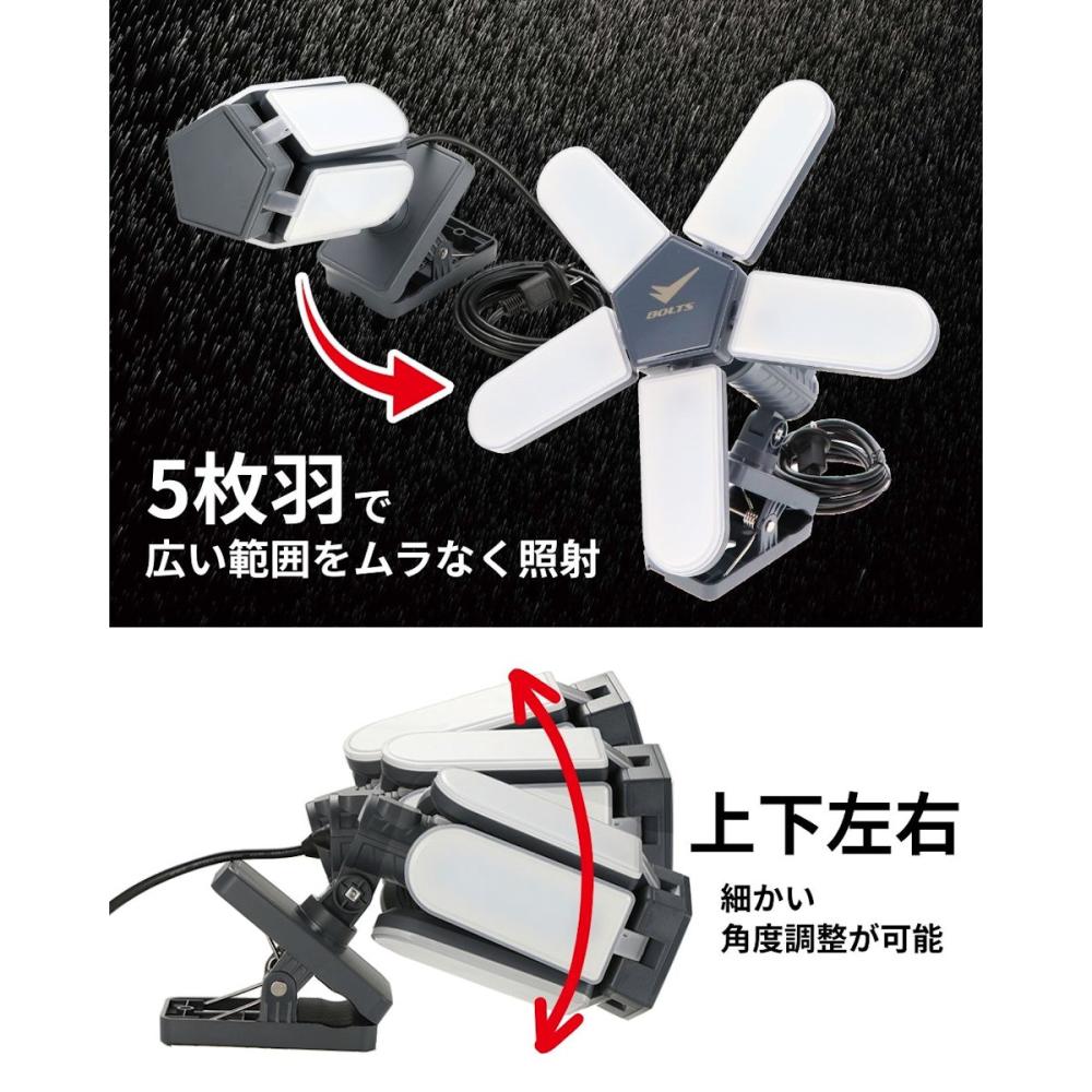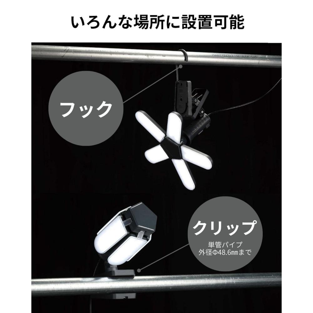 ●クリップ・フック付きなので壁や天井、単管(48.6mmまで)にも設置可能