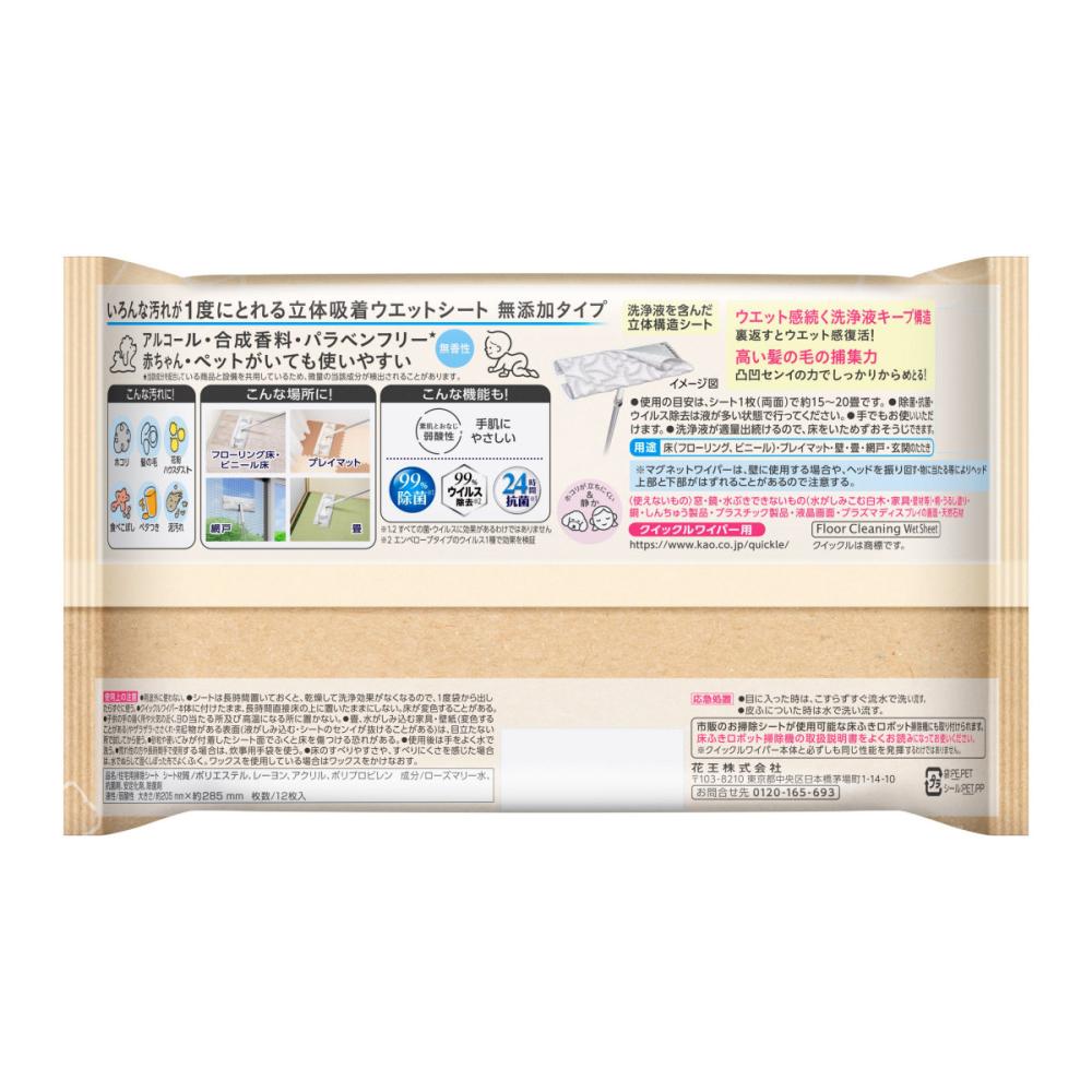 汚れ落ちとやさしさを両立した無添加タイプのウエットシート。 髪の毛、ベタつきまで掃除機かけずに一度でサッパリ! 洗浄液を含んだ立体構造のシートにより、髪の毛・ホコリ・花粉・ハウスダスト・食べこぼし・泥汚れまで一度に拭きとれます。 洗浄液は、小さなお子様やペットがいても使いやすい、アルコール・合成香料・パラベンフリーの無添加タイプ。 無香性。 手へのやさしさを考えた処方。 手肌とおなじ弱酸性。