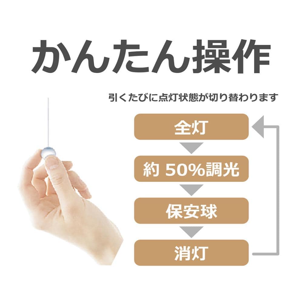 ・プルスイッチ(引きヒモ)で明るさの調節が可能(全灯→50%調光→常夜灯→消灯)