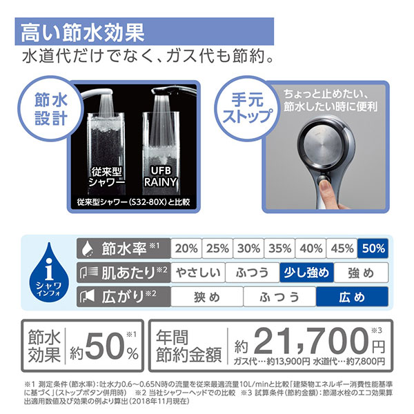 エコへのこだわり:節水効果約50%。快適な浴び心地と同時に高い節水効果も実現しました。水道代だけでなく、湯を沸かすガス代も節約できます