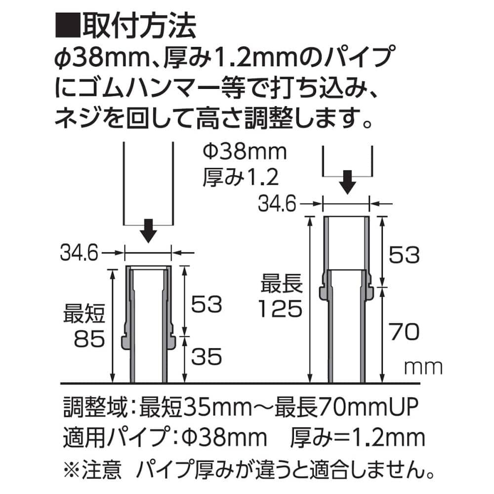 調整域:最短35mm~最長70mmUP 適用パイプ:パイプ径38mm 厚み=1.2mm 最大荷重:9.8kN