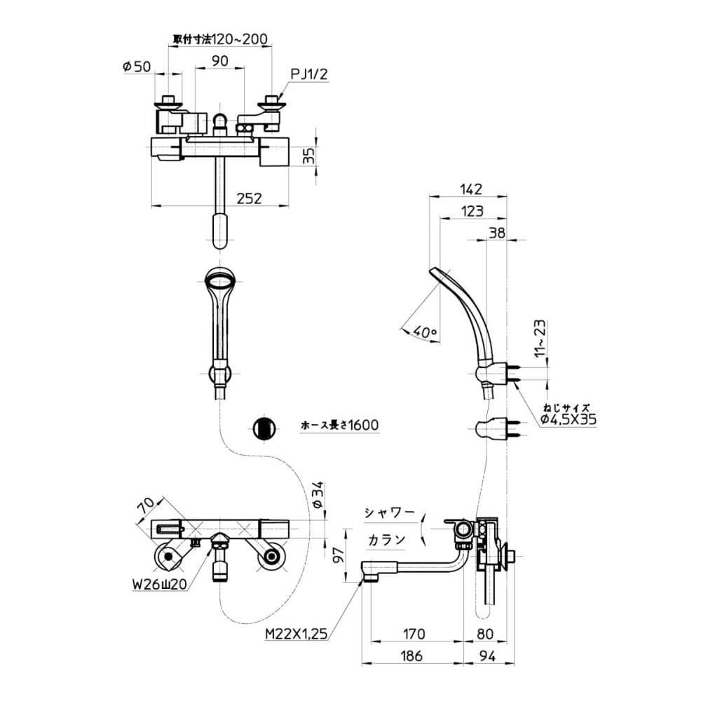 デザイン:メッキとブラックのシンプルなデザイン。パイプの長さ:170mm ホースの長さ:1.6M 取付ピッチ:120~200mm