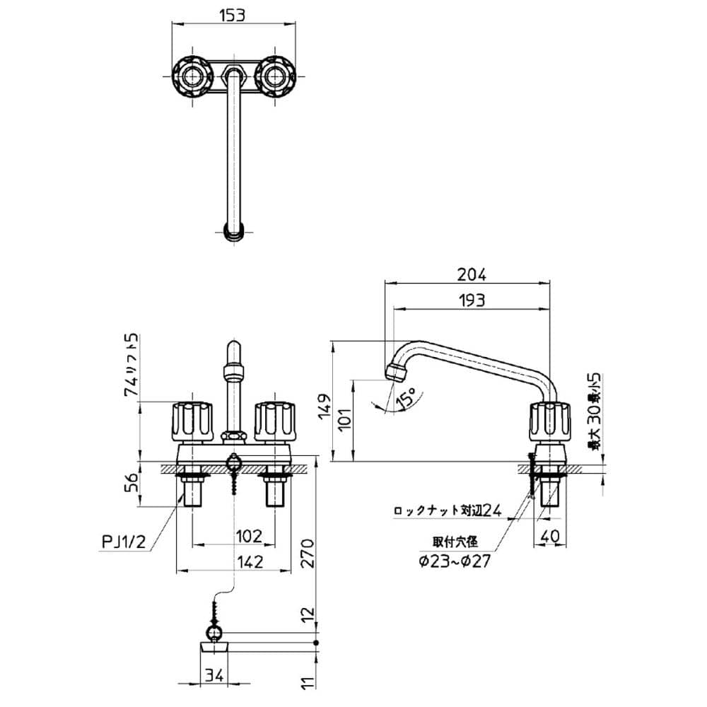 呼び13 ネジサイズ:PJ1/2 取付ピッチ:102mm ロックナット対辺:24mm 取付穴径:23~27mm パイプの長さ:193mm