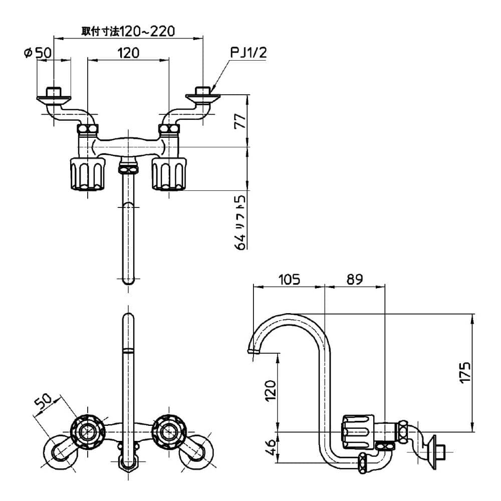 呼び13 取付ネジサイズ:PJ1/2 取付寸法:120~220mm