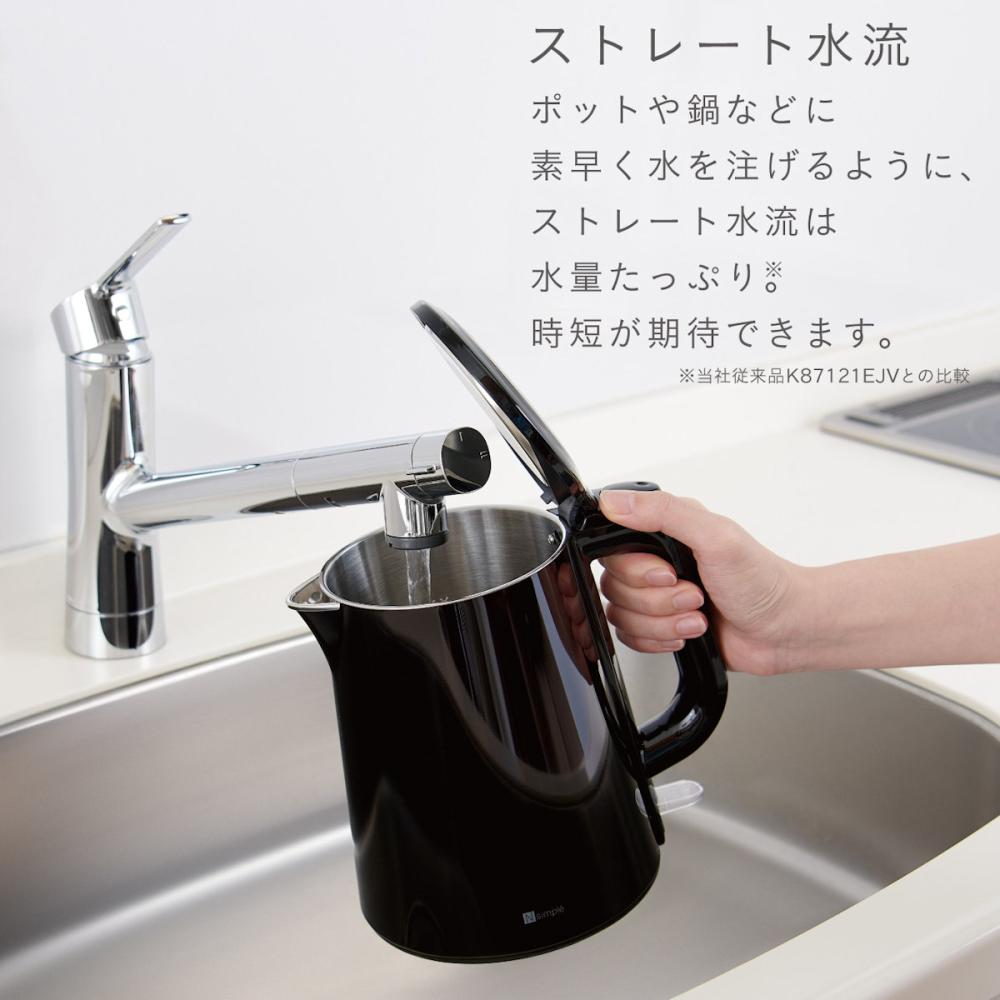 水ハネ軽減シャワー&時短ストレート:食器や食材を洗う時にオススメなシャワー水流と、ポットや鍋などに素早く水を注げるストレート水流。吐水口の位置も高く、お鍋やポットに水を注ぎやすい。