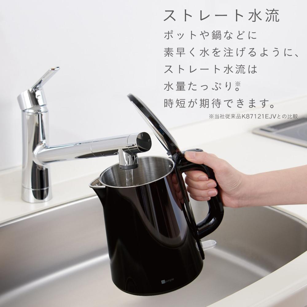 水ハネ軽減シャワー&時短ストレート:食器や食材を洗う時にオススメなシャワー水流と、ポットや鍋などに素早く水を注げるストレート水流。吐水口の位置も高く、お鍋やポットに水を注ぎやすい。