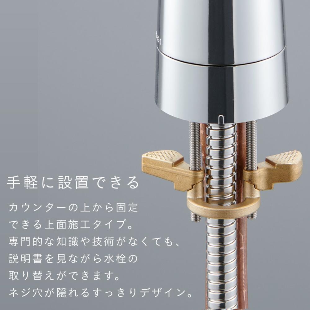 施工も楽々上面施工タイプ:カウンターに潜ることなく、上から一人で施工いただけます。また、本体の台座が90°裏に回るため、ビス穴を隠せて正面がすっきりします。