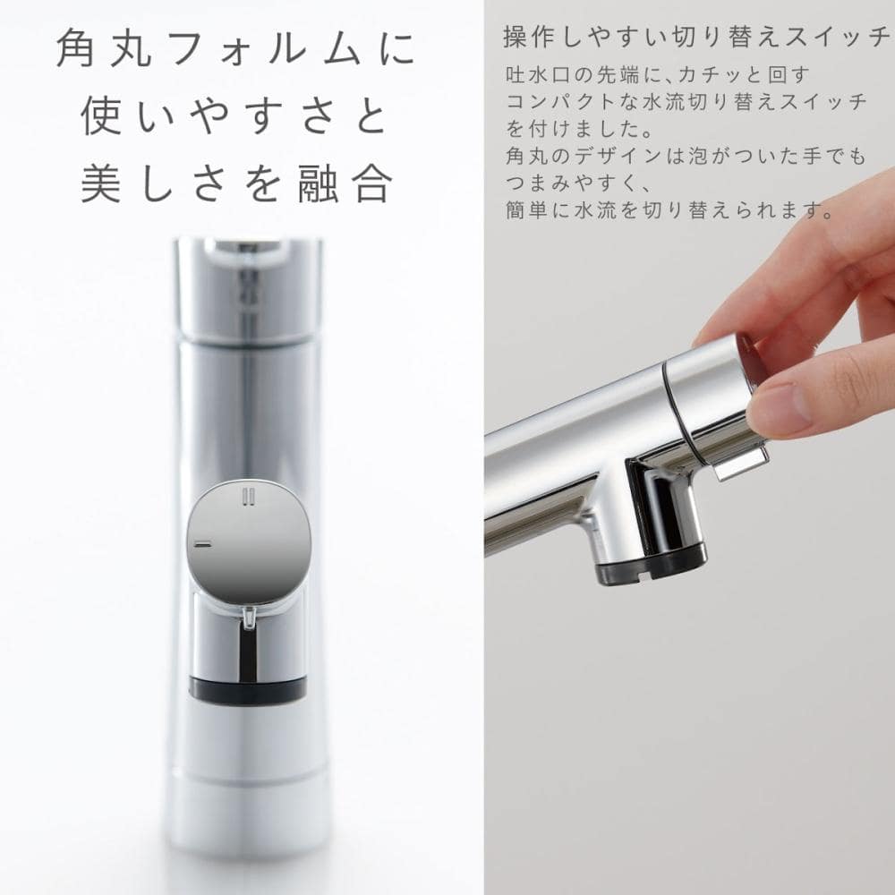 操作しやすい切替スイッチ:吐水口の先端にカチッと回すコンパクトな水流切替スイッチを付けました。角丸のデザインは泡がついた手でもつまみやすく簡単に水流を切り替えられます。