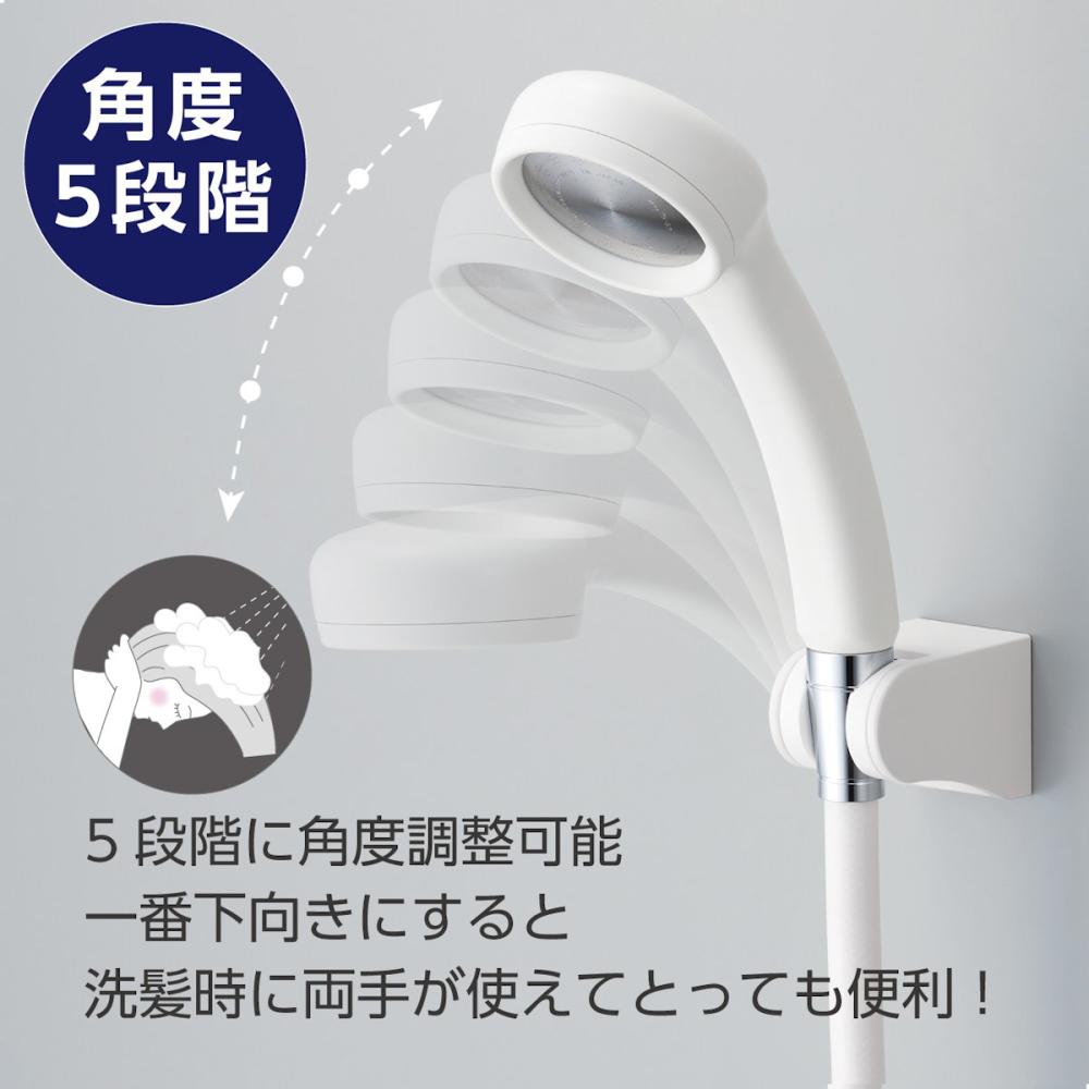 シャワー掛具にシャワーヘッドを差し込んだ状態で、角度を10°刻みで5段階に調整可能です。お好みの角度に合わせて使えます。