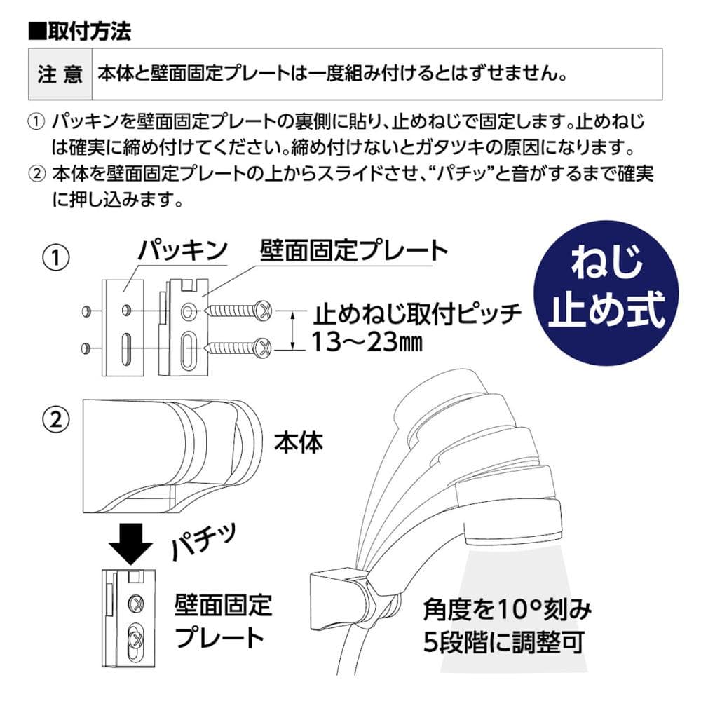 取付方法:パッキンを壁面固定プレートの裏側に貼り、止めねじで固定します。止めねじは確実に締め付けてください。締め付けないとガタツキの原因になります。本体を壁面固定プレートの上からスライドさせ、パチッと音がするまで確実に押し込みます。