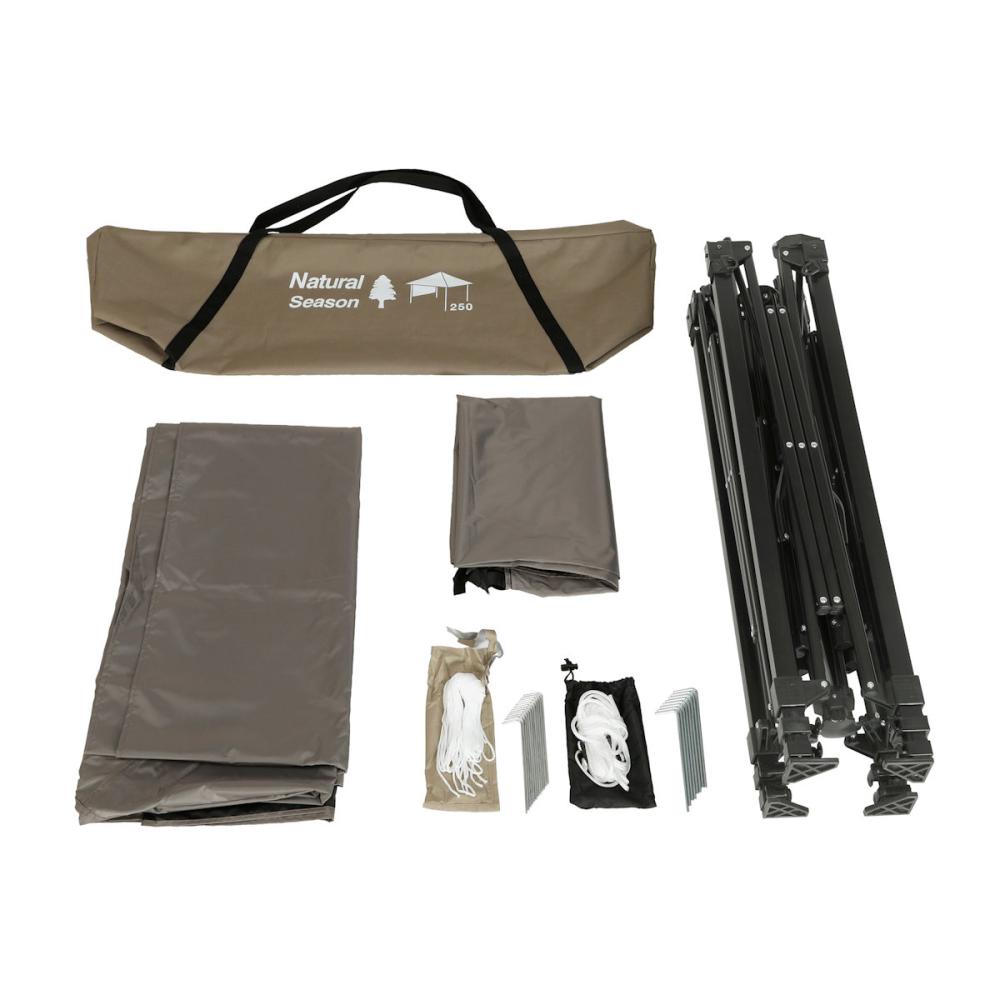 材質/天幕:ポリエステル、裏面:ブラッククールコーティング加工、本体フレーム:スチール・ナイロン・ポリプロピレン