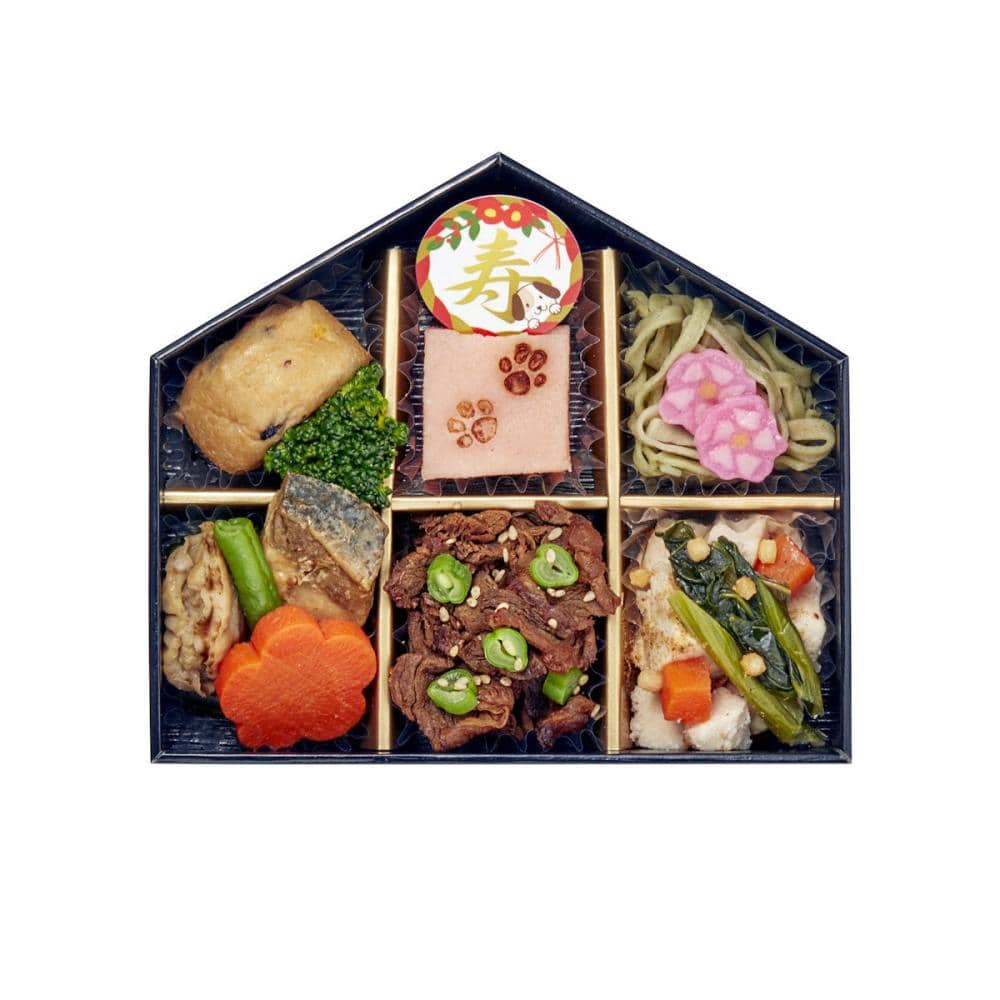 馬肉のしぐれ煮や、お正月の定番であるお雑煮をイメージした鶏肉のお雑煮風などのお肉料理に、ぶり照焼とベビー帆立の甘露煮などの魚料理、モロヘイヤうどんや肉球の焼き印がかわいいしんじょうなど、彩り豊かな具材を絵馬に見立てた五角形のお重に詰めました。