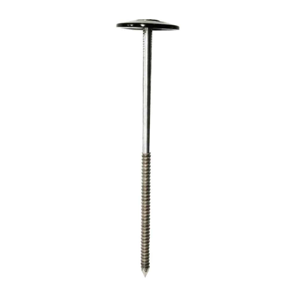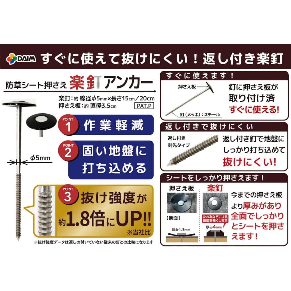 釘に押さえ板が付いており手間であった板の取付作業の必要が無く作業軽減で省力化できる防草シート押さえ釘です。