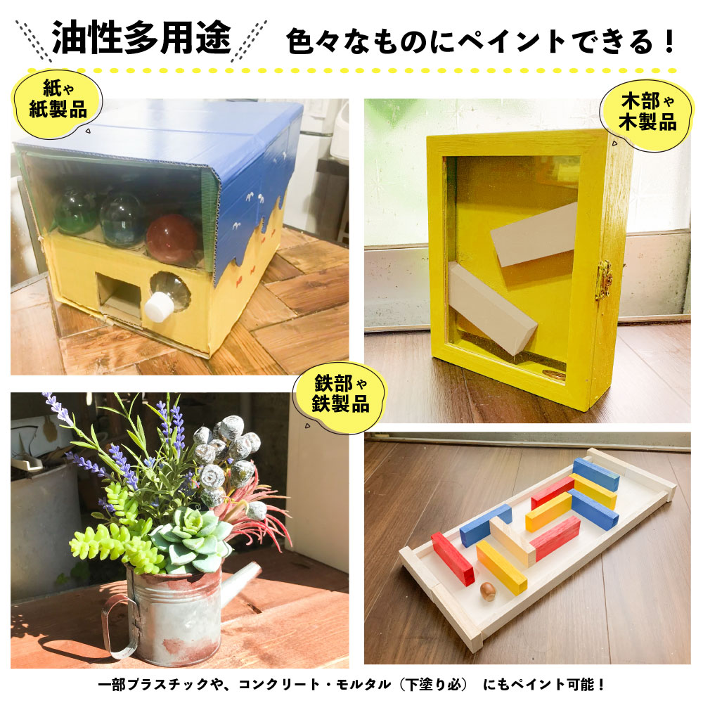 ●木製品/鉄製品/プラスチック(一部塗れない場合があります)/コンクリート/モルタルなど